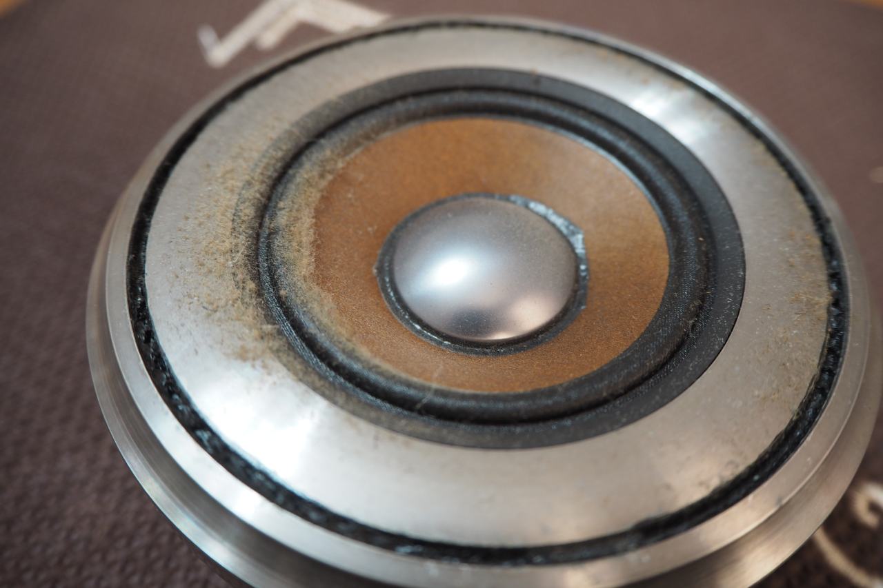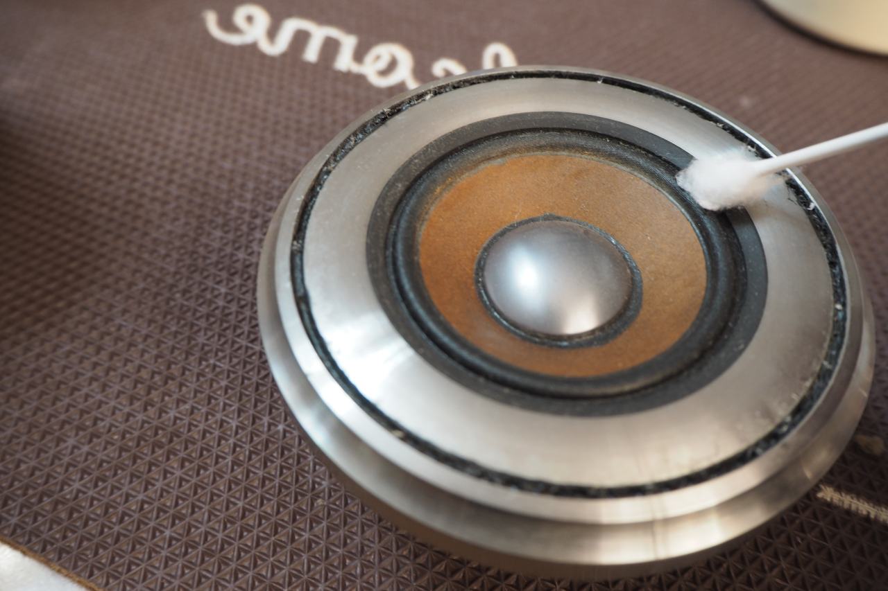 脂と水分の混じった汚れにホコリがまとわりついて固着しているから、こんなのはブロワーで吹いても落ちないです。コレを綺麗にしていきましょう。ラウドスピーカーのメタルドームは繊細です。ちょっと応力を掛けただけで、簡単にエクボが出来てしまいます。(もちろんソフトドームも繊細です)間違ってもドームをヤッてしまわないように、慎重に作業をします。ドームを潰すくらいなら汚いままの方がマシです。