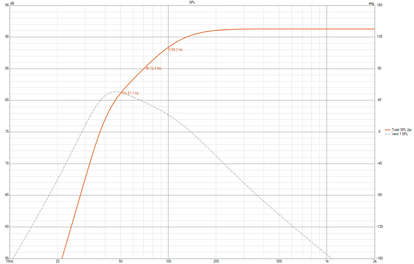 実測した特性と、カタチは凄く似ています。かなり高い周波数(160Hz)から低下がはじまり、50Hz付近でバスレフの山を作るが音圧は足りず、そしてその下はズドンと減衰する。