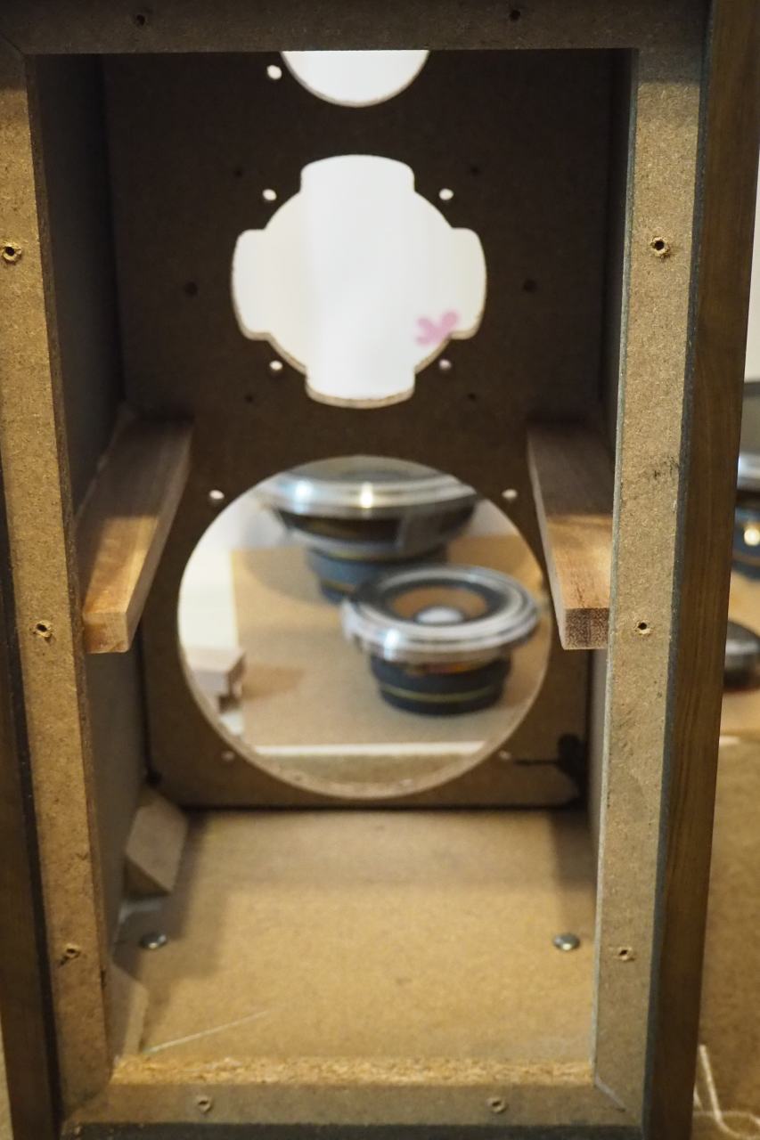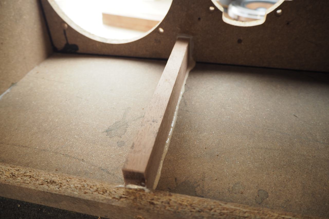 両脇へ2本の補強材がうまいこと付きました。ほぼガタなしです。ブレーシングが付いている箱と付いていない箱を拳で叩いてみると、やはり打音が違うように聴こえます。