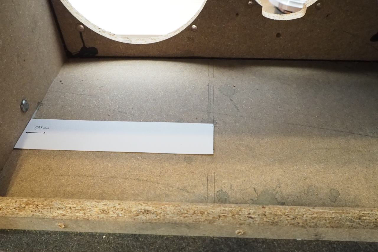 …といってもこんなモンに過剰コストは掛けたくない。そこも最小限です。過剰なブレーシングをすると、内容積が大きく削れてしまう。シミュレーション結果からもタダでさえ内容積不足のこのスピーカー。補強材の容積も最小限にしないといけません。箱を叩いていると、板厚のあるバッフルはバスケットによる補強も効くし、無問題。天地は面積が小さいから15mm厚でも十分でほぼ鳴かない。問題はやっぱりサイドパネルです。ここが叩くとゴンゴンと無く。しかもかなり尾を引く。