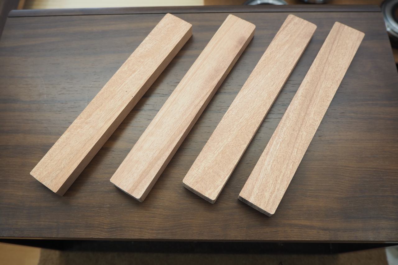 成形・準備したのは上図4本の部材です。ラワン単板。ひとつの大きさは14mm x 30mm x 199mm。