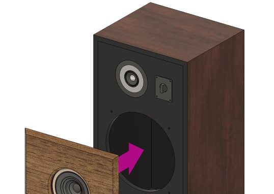 …といってもこんなモンに過剰コストは掛けたくない。そこも最小限です。過剰なブレーシングをすると、内容積が大きく削れてしまう。シミュレーション結果からもタダでさえ内容積不足のこのスピーカー。補強材の容積も最小限にしないといけません。箱を叩いていると、板厚のあるバッフルはバスケットによる補強も効くし、無問題。天地は面積が小さいから15mm厚でも十分でほぼ鳴かない。問題はやっぱりサイドパネルです。ここが叩くとゴンゴンと無く。しかもかなり尾を引く。