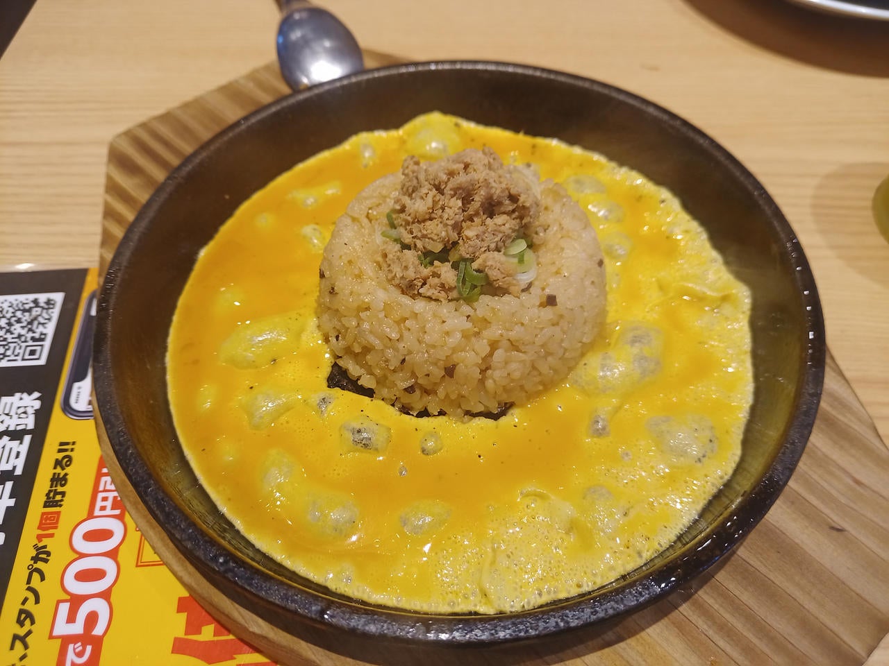 たとえば、これは私が頼んだチャーハンセット(ミニ)ですが、生の卵が鉄板で提供され自分で混ぜるスタイルが妙に楽しい。見た目もよし。他の卓も観察すると、やたらサイドメニューがオーダーされています。なるほど、ラーメン一本勝負ではこうはいかない。人気の一端を見た気がします。