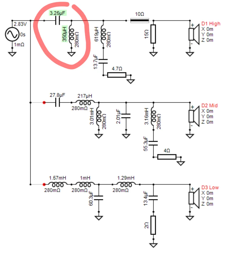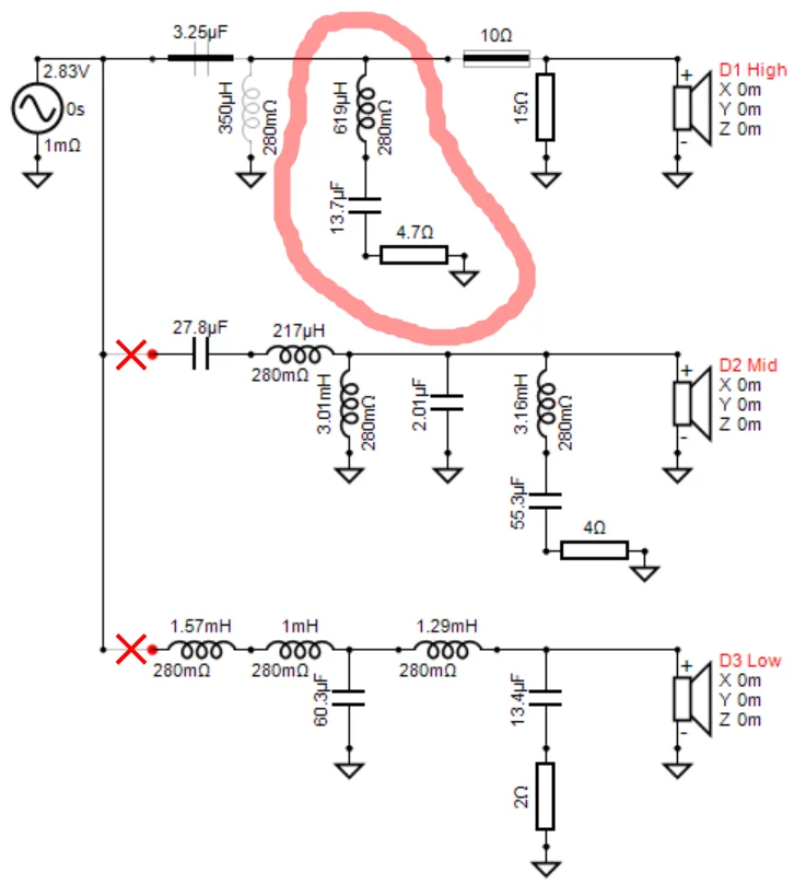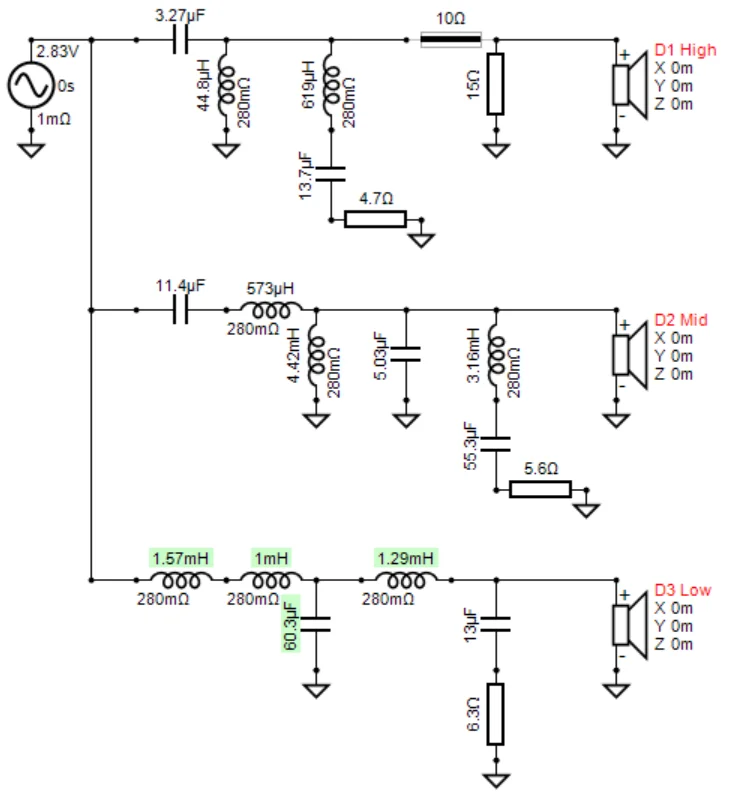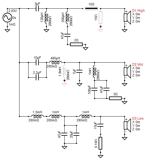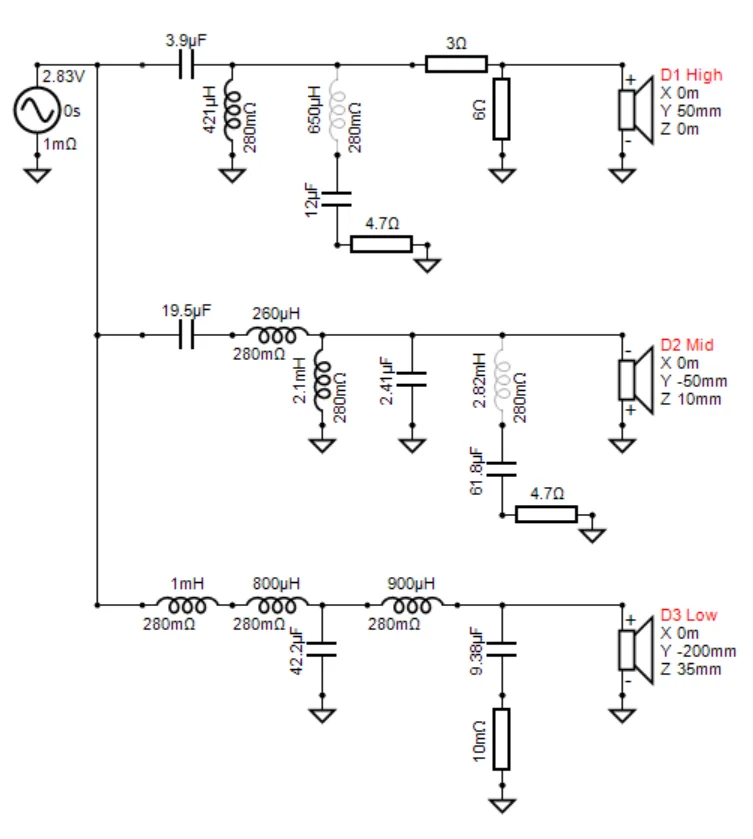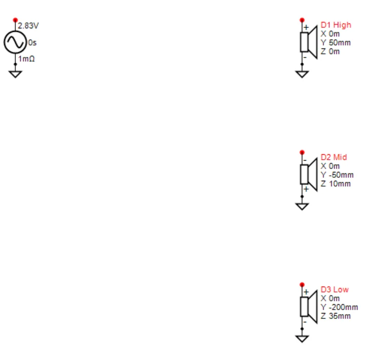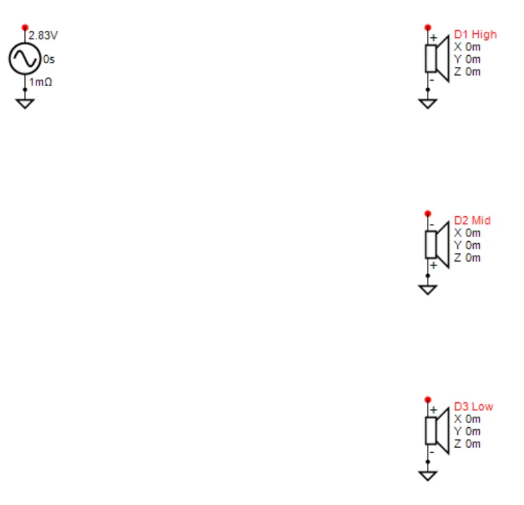 まずこれは3wayですから、回路図上に適当な名前 (Low, Mid, High)でドライバーを3本置きましょう。