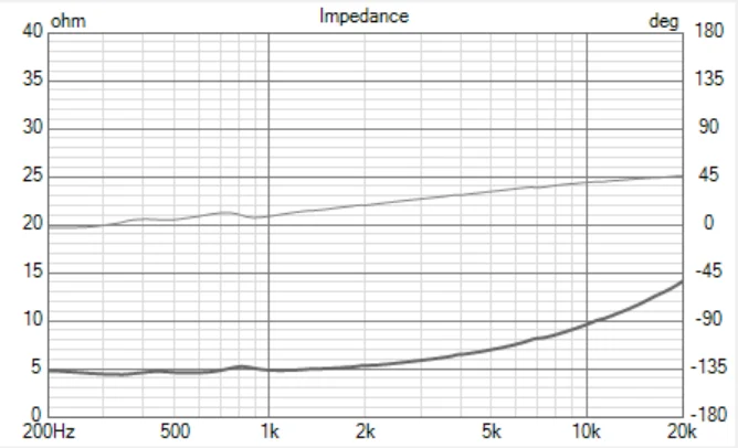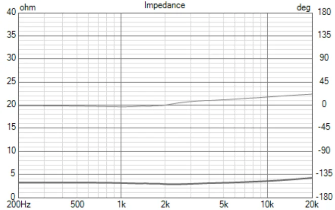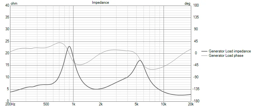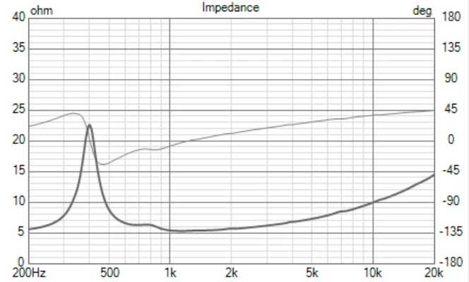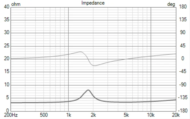 これはミッドレンジのインピーダンスカーヴです。これをそのままにしておくとウーファーとのクロスが上手く行きませんので、