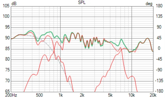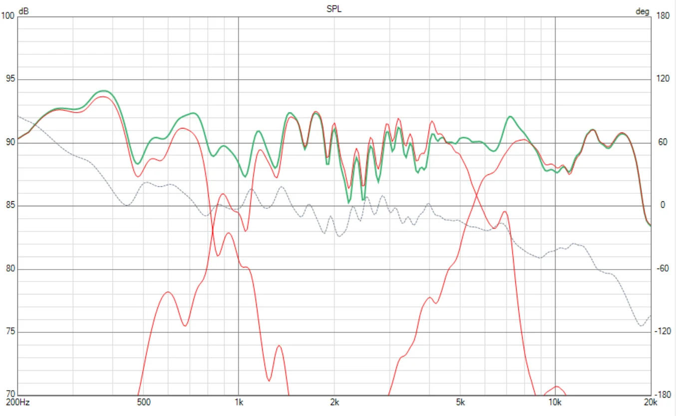 緑色が3wayの合成特性です。ウン、まあこんなものでしょうね。ヒデーもんです。これでは音楽になりません。インピーダンス曲線とf特の乱れが効いて、ミッドもウーファーもトゥイーターも大幅にオーバラップ(赤線)しているから平坦につながりようがありません。