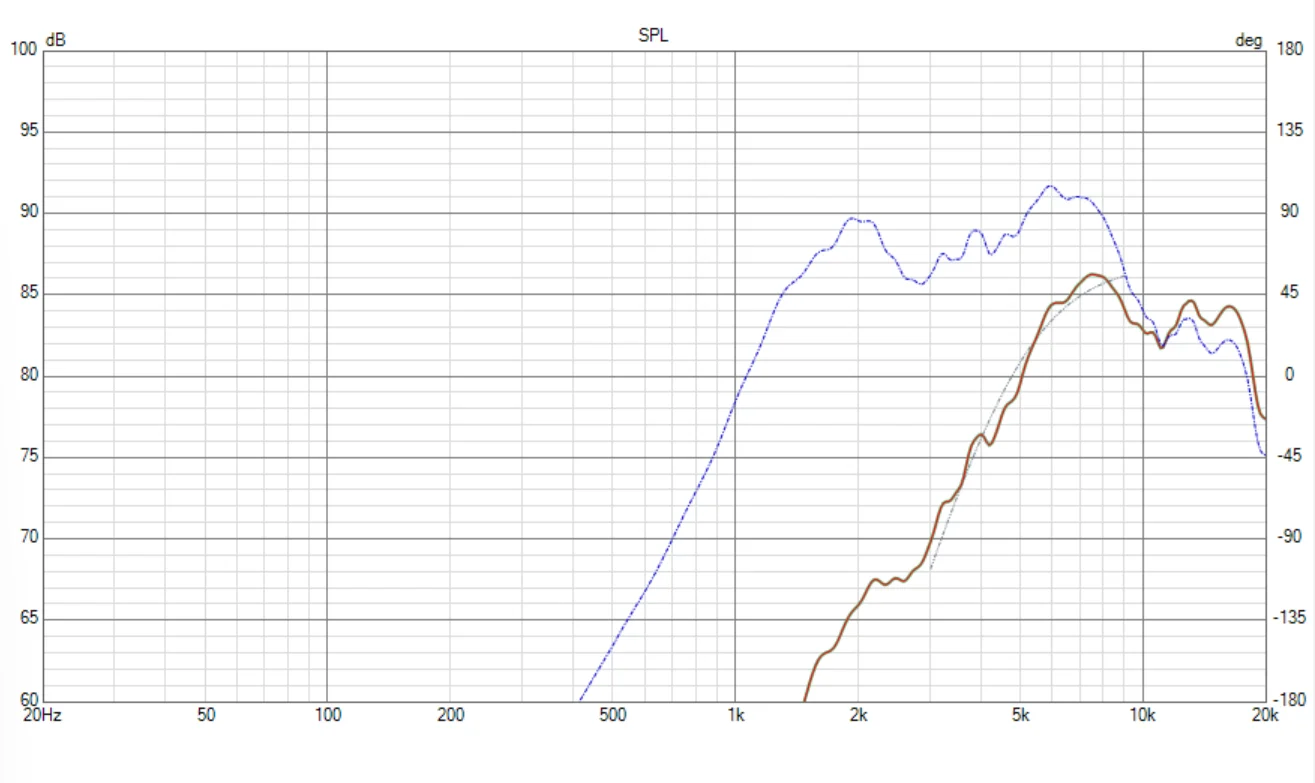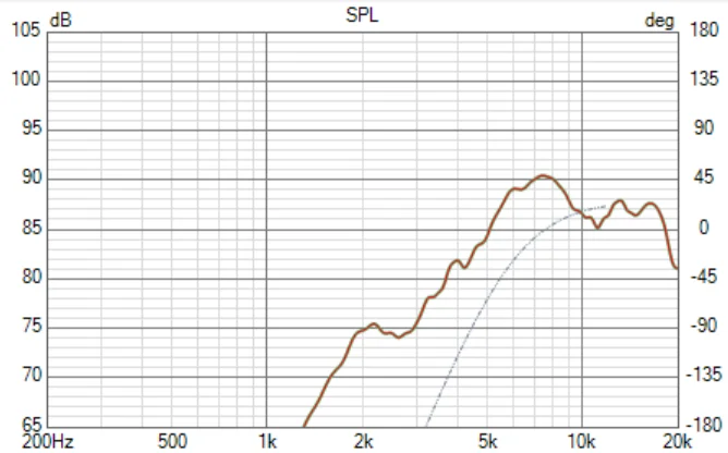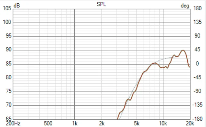 グレーの点線は最小位相特性ですが、そんなに悪いもんでも無いですよね。特に400-7kHzはマアマア見れます。問題は高域ね・・・高域にいくに従って位相は乱れていきます。普通は逆なんだけどな。振幅特性もそうなんですが、このトゥイーターは余り物理特性が良く無いのでしょう。もう少し皆さんにも解りやすく言うと、このトゥイーターは酷いモノです。プラズマがどーちゃの言ってるヒマがあったらもっと他にやることあんだろ。