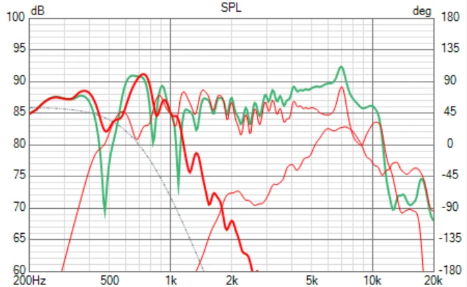 グレーが調整前のXoverを通した周波数特性。グレー点線が調整すべきターゲットカーヴを示しています。