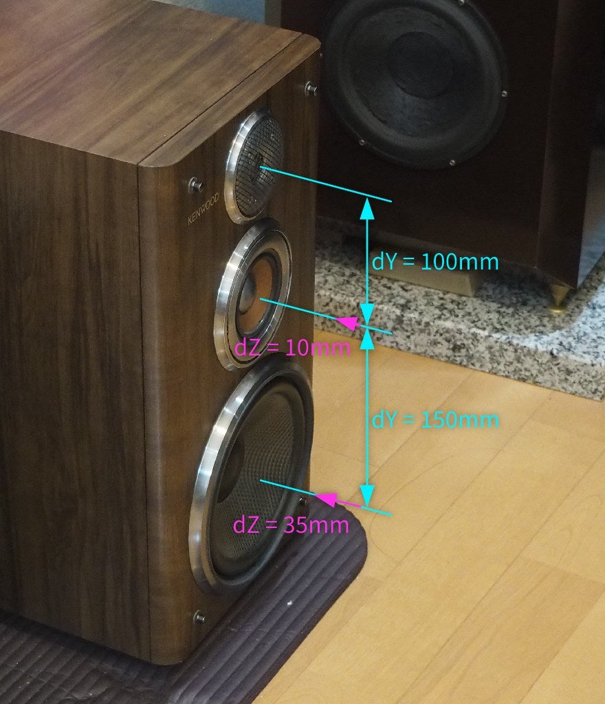 このラウドスピーカーシステムはVICTORやHITACHIのようにドライバー配列が揺らいでおらず、インライン配置だからXは全部X=0です。一方Yはドライバー間距離であり、トゥイーター/ミッド間で100mm、ミッド/ウーファー間で150mmでした。