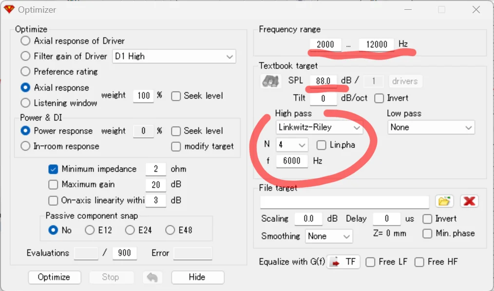 Optimize対象とする周波数レンジは、広すぎても狭すぎてもいけません。Optimizeに無理がある/出来もしない帯域まで広く含めると、そちらに引っ張られて全体の最適化に失敗します。だからといって、最小限に狭くしすぎると、対象外の帯域は完全無視されて、対象外の帯域特性をメタメタに壊されてしまいます。つまり、トライ&エラーで最適なレンジ幅を選択していきます。特に、今回のように特性が「詰んでいる」「汚らしい」ドライバの場合は尚更です。