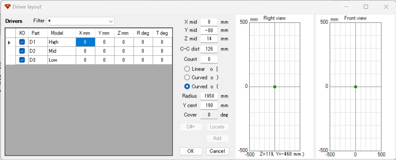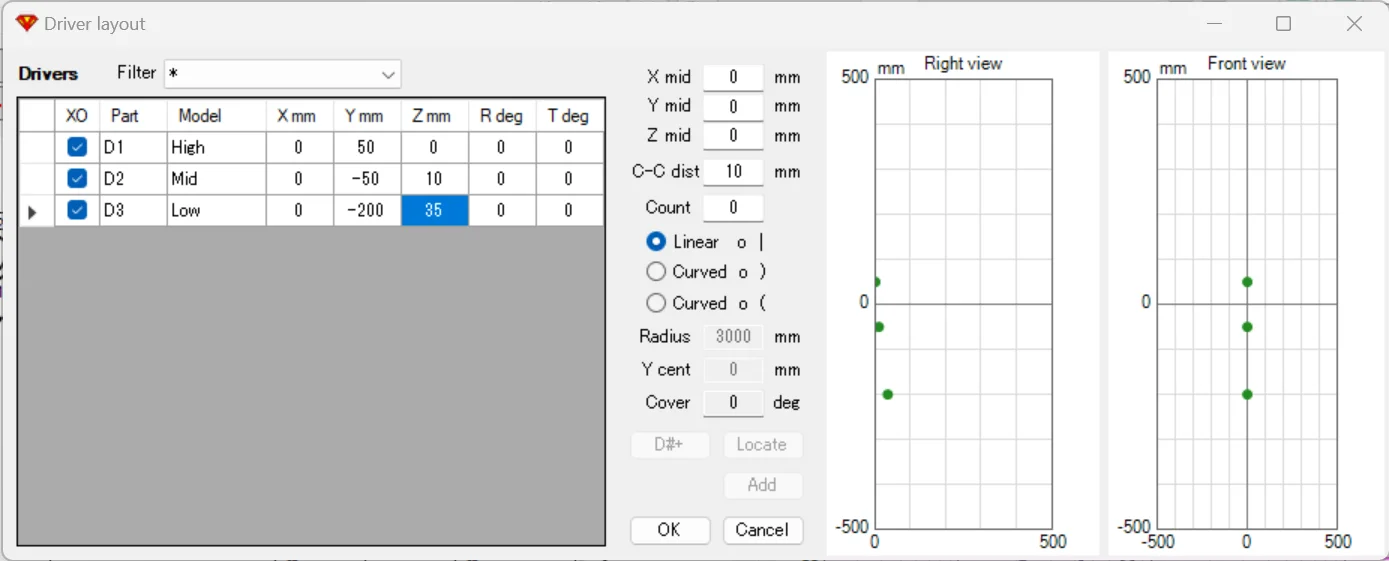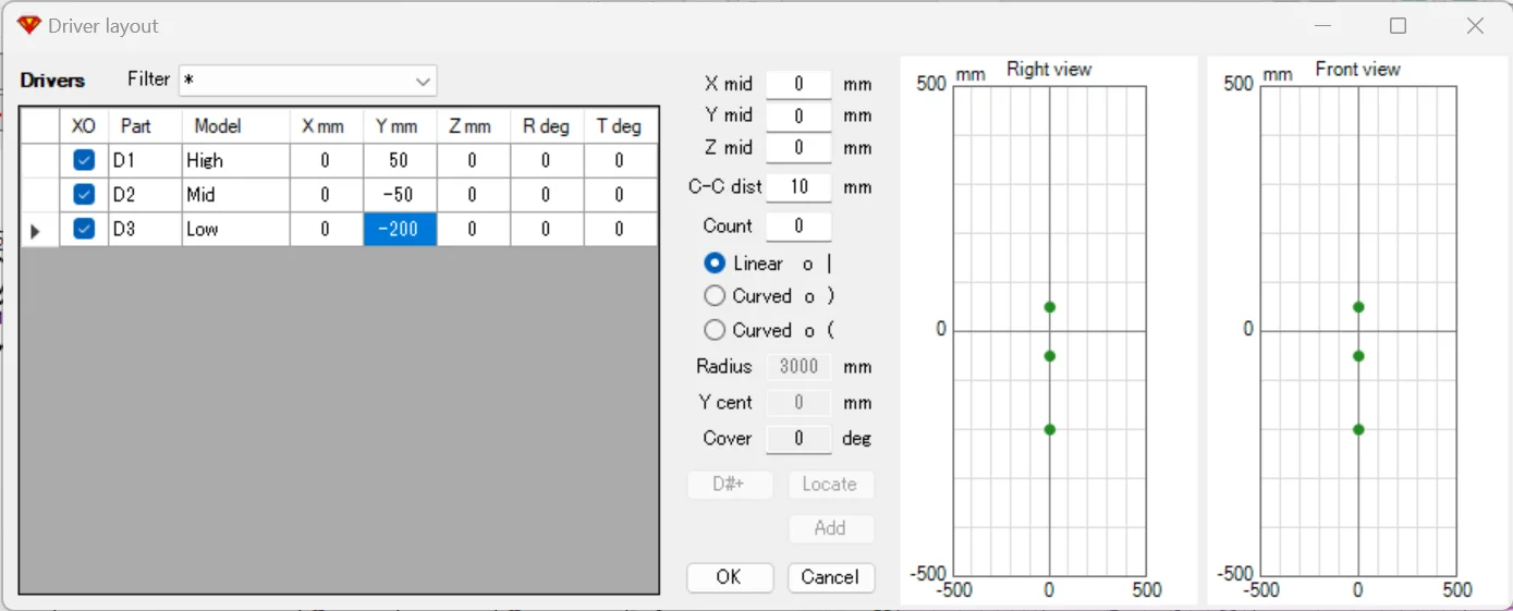 今回はミッド~ウーファーの中間を仮想アコースティックセンターとしたいので、Yには+50, -50, -200mmを記入します。すると、上図のように3ドライバーのセンター位置がオフセットされます。
