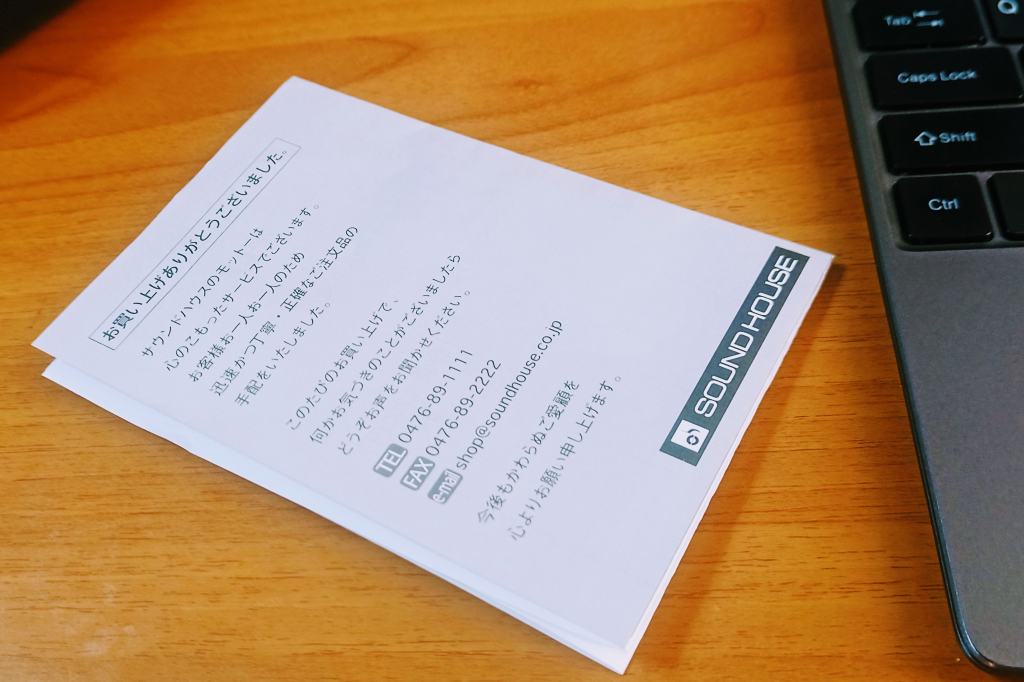 SOUNDHOUSEさんへ発注していたモノが翌日には即配されました。SOUNDHOUSEさんは年々配送スピードが向上していますが、とうとう翌日には到着するようになり…。まさにAmazon並です。商品力だけでなく物流面でも今や競争は実に苛烈です。また、どんなに安価な発注であろうと梱包には必ず礼文のリーフが入っていて、顧客を重視するブランディング活動を強く感じました。ホントそういう施策を各所に見るようになりましたね。