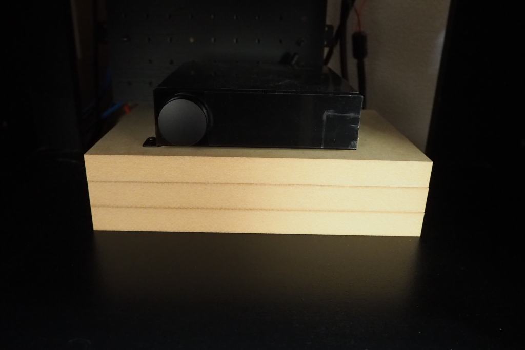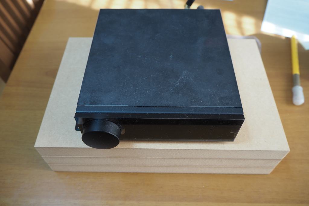 これ以上嵩上げすると、今度はリモコン信号が届かなくなってしまいそうです。見た目は悪いですねえ。もう少し何とかしたいですが、もう少し考えます。台座のルックスもね。。。MDF剥き出しではね。