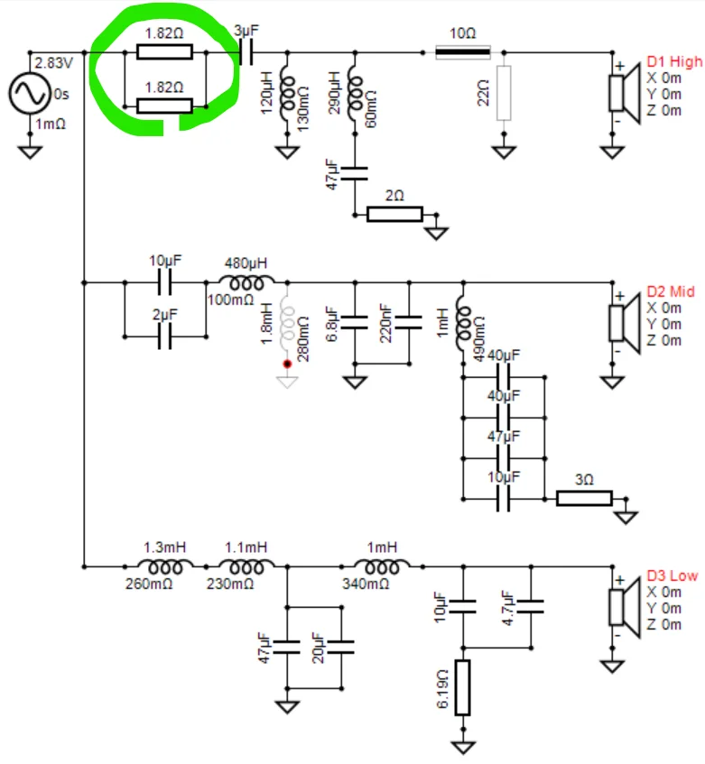 これにより最高域の最低インピーダンスは3Ωになりますのでまずは安全です。ただ、トレードオフとしてトゥイーター領域の音圧が2dB低下してしまうんですよね。現在の高域が繊細で微粒子感があるので、すこし残念です。