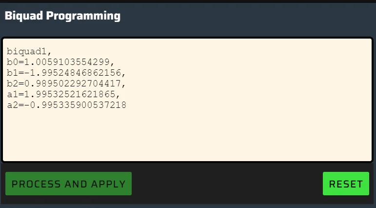 それをminiDSPのAdvanced Filter = Biquadの項へ入力するだけで、セットアップが完了するんです。私に言わせれば、フィルタ係数を勝手に計算してくれるソフトもminiDSPの安直環境提供も、すべてがチートです。