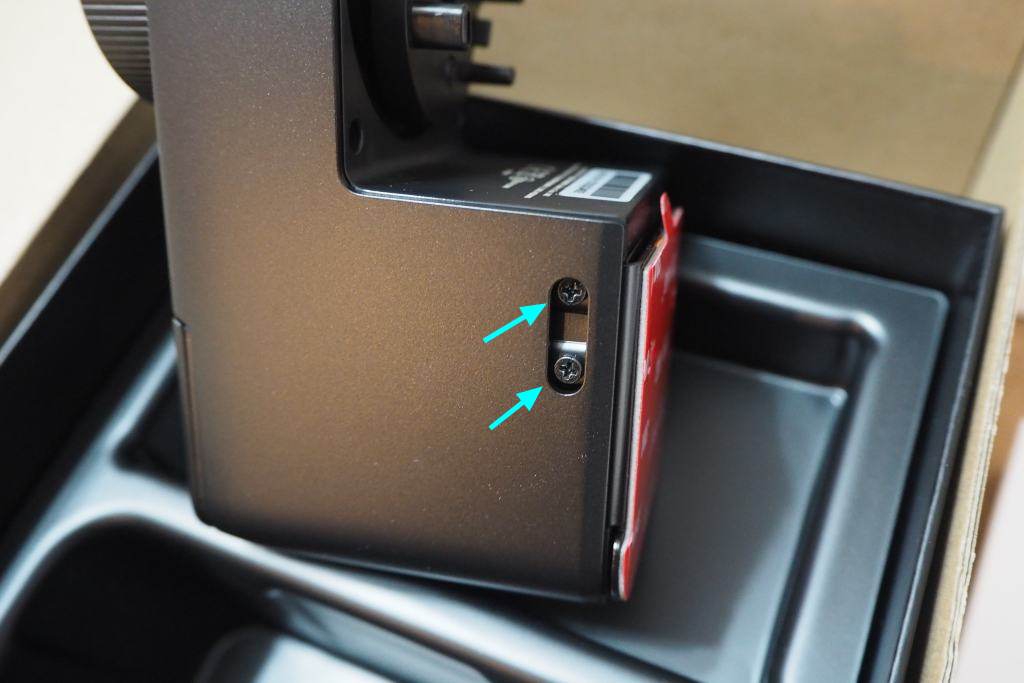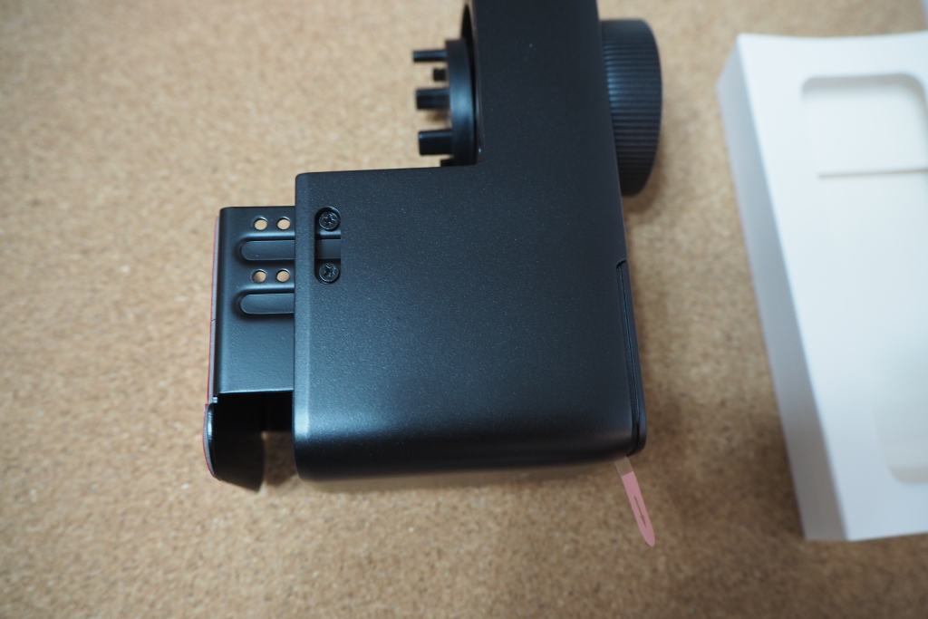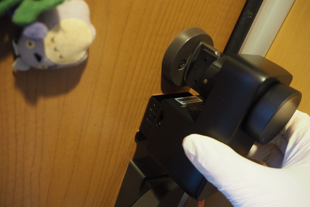 さきほどのアタッチメントにガチャンとはめ込んでから、住友製の強力両面テープで接着です。予備の粘着テープも1個付いてます。ばっちり付きました。ここが最大の難関。こう見えてけっこう質量があるのです。バッテリーが重い。