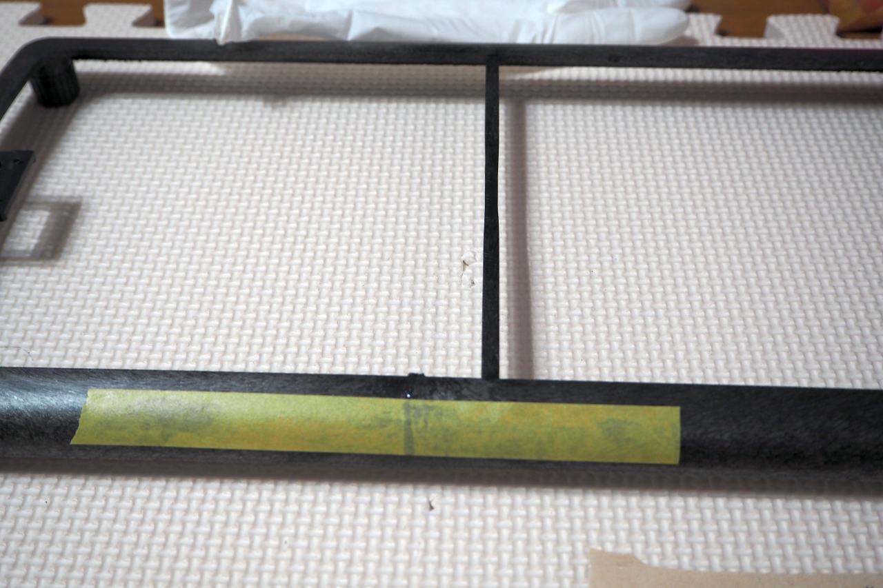 フレームもご覧の有り様で、LRとも同じ場所がばっきり折れています。ムリに引っ張ったか、それとも踏んづけたのか。ということで、まずはフレームの補修をしていきたいと思います。