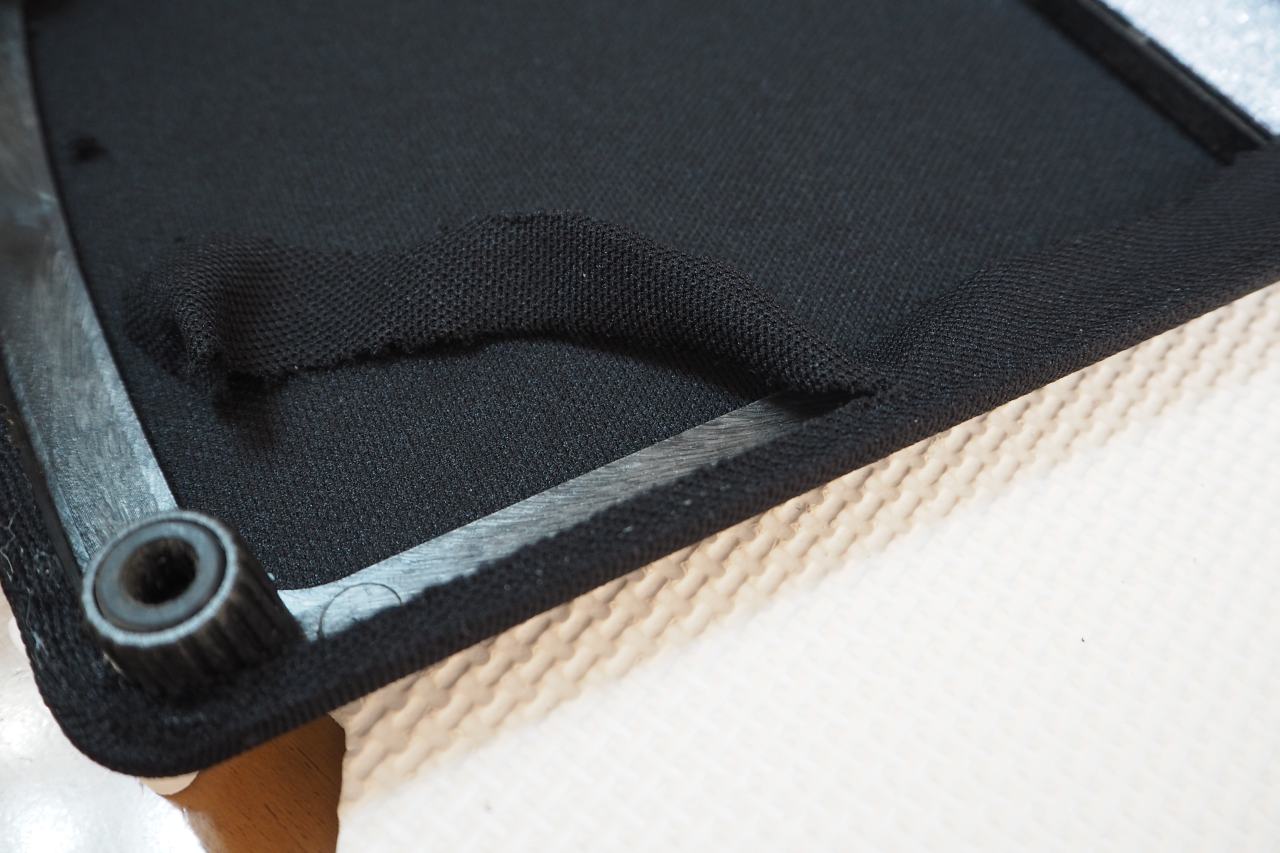 枠に対し、ほんの僅かに大きめの布を切り出します。ほんの僅かでいいんです。どうせテンション掛けて張れば大量に余りますので。接着にはボンドG17を使いました。