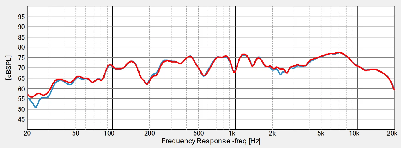 ウン・・・イイ感じ。以前書いた感想文と同じです。確かに低域は少しだけ伸びて良くなった気がしますが、でも総合的な印象はそんなに変わらないかな。私が揶揄していた中低域の「クセ」みたいなものは、相当に良くなった気がします。これはウーファーサラウンドの軟化が効いたのかも知れないし、もしかしたら側板の補強も多少効いてるのかも知れないです。そのことは周波数特性上も現れています。ただ、それによって「低域が凄く伸びて良くなったな…」とかはあんまり無いですね。