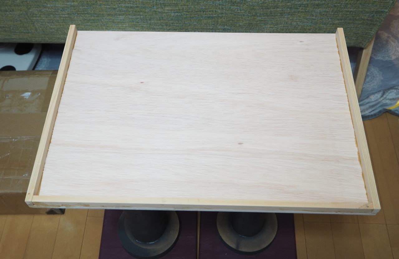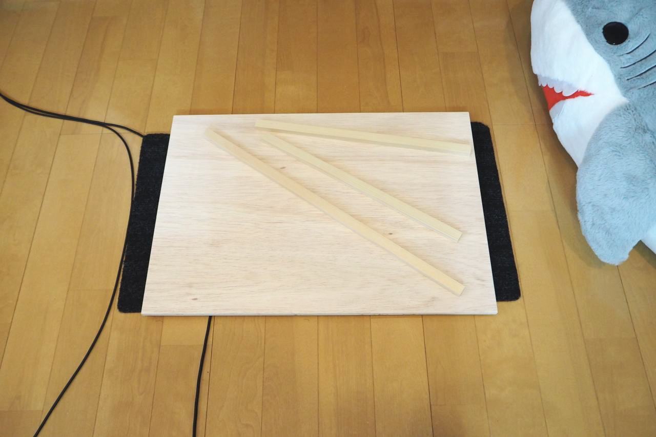 厚いといったって、12mm厚です。百均では売っていないので、ホムセンで格安のラワン合板買ってきました。