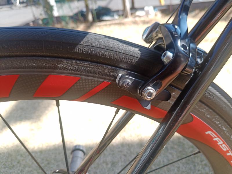 そのあと試走で気づいて、すぐに交換しました。どっち向きが正解か、すぐに分からなくなります。リアホイールの方は、向きが正常だったみたい。