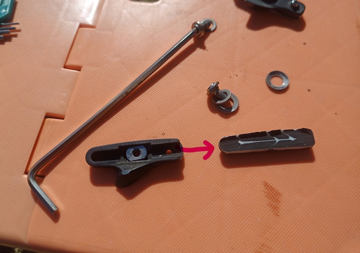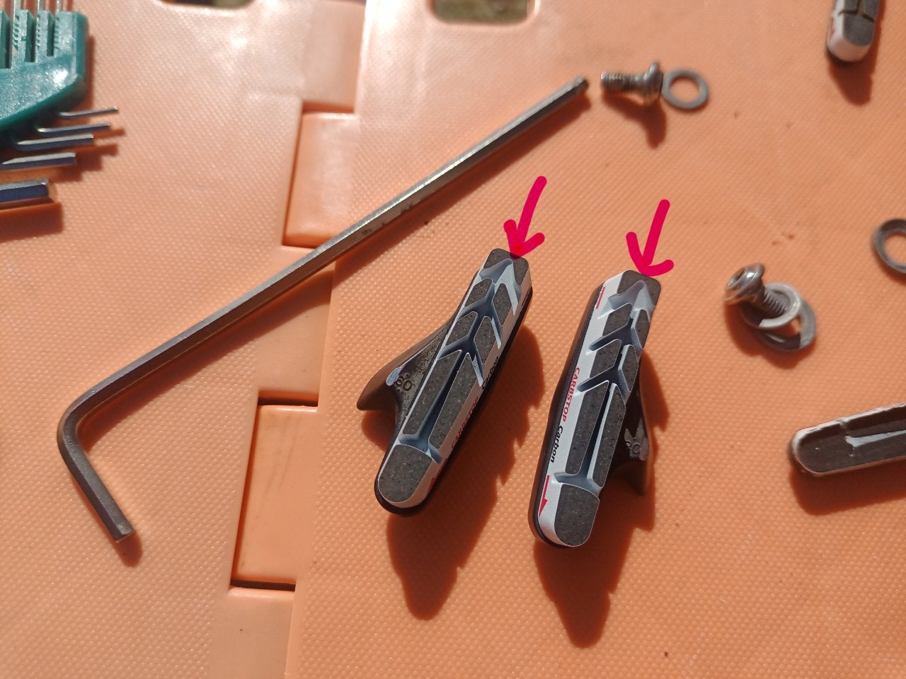 セカンドバイクのリア・リムブレーキパッドが限界近いので、4ケとも交換します。うちは全部リムブレーキですが、カーボン用ってやたら減りが早いですね。気のせい?