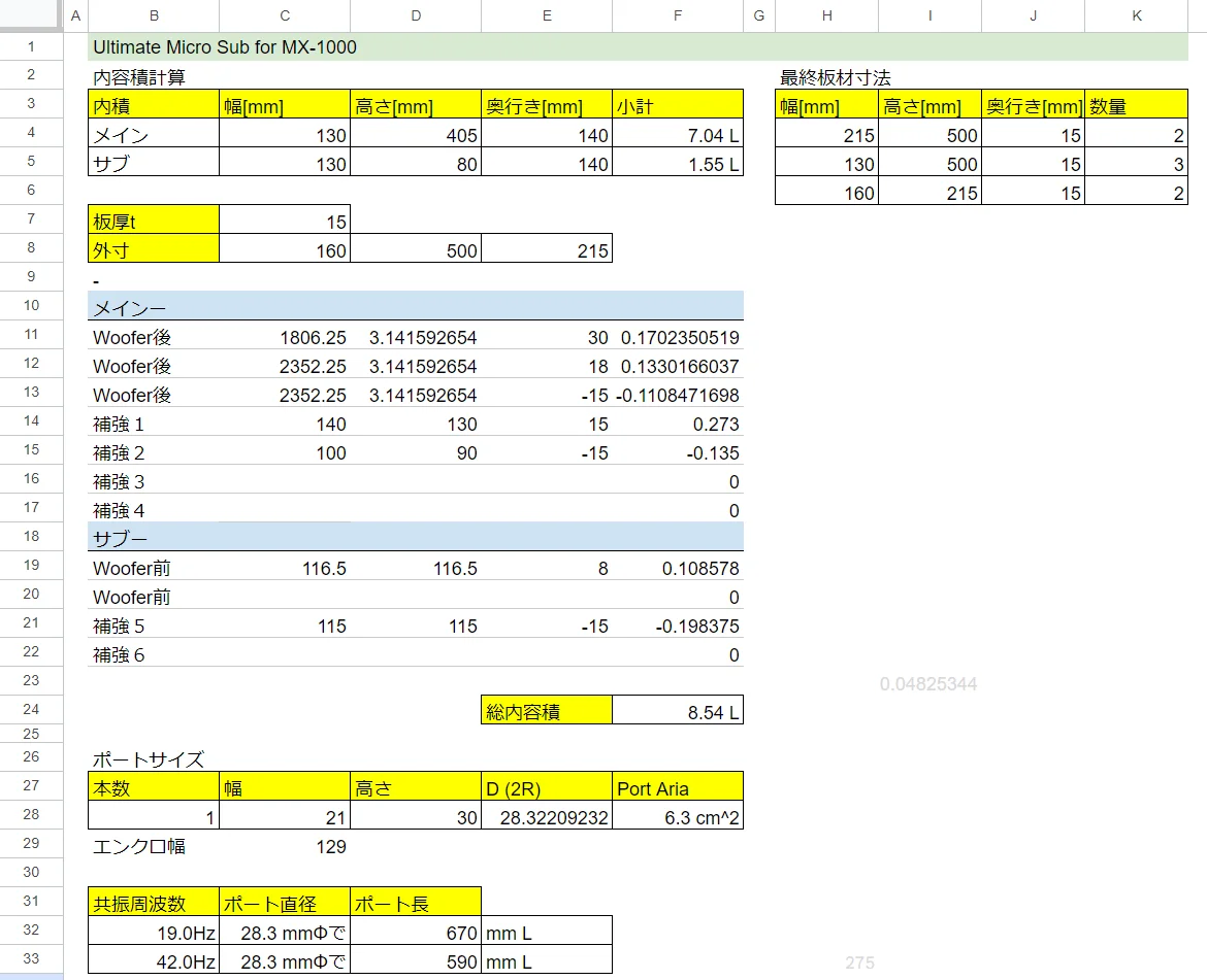 でもね、MicroSubは仕方がないんですよ。8.5Lの小容量でポート直径を増やすと、ポートレングスが何mにも長大になり、オマケにバンドパスなんだか共鳴管スピーカーなんだか分からない構造になってしまいます。今のポートサイズは現実的だなと思っています。