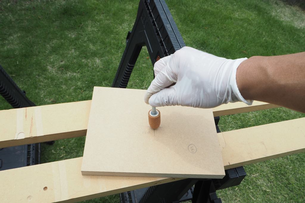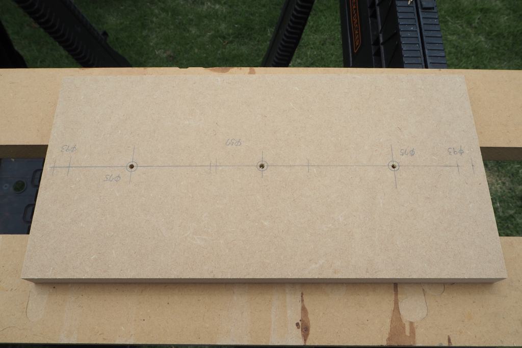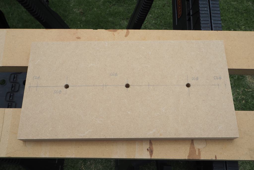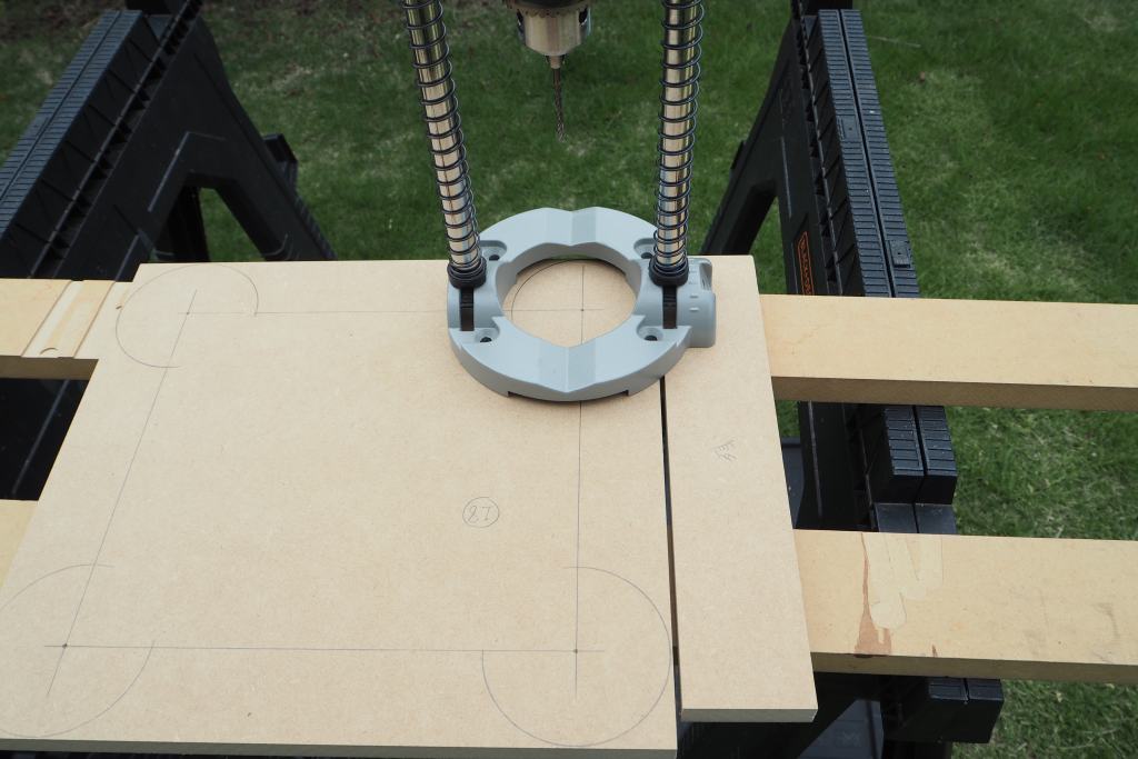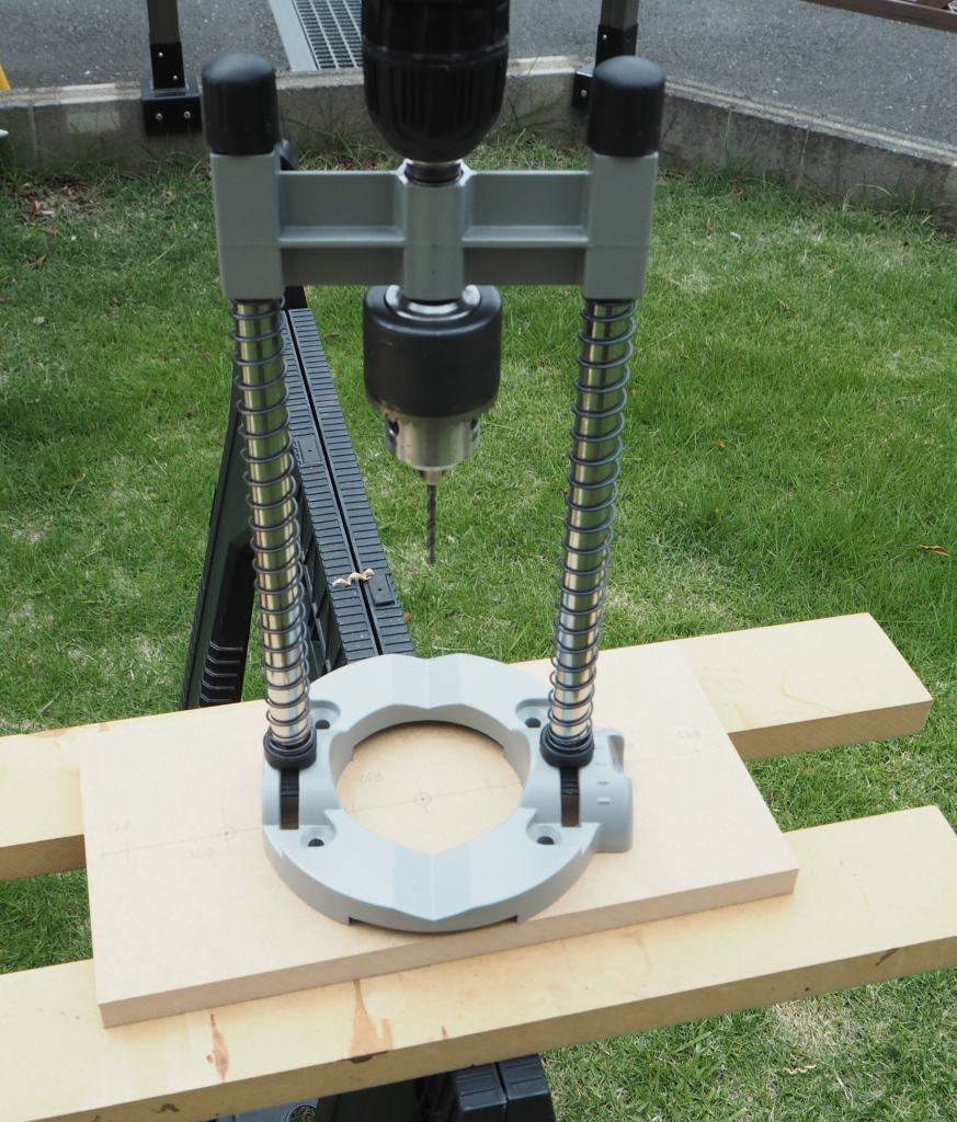 板の外周過ぎて、垂直ドリルガイドが脱落しちゃいそうなときは、このように端材などを外周に敷いて補助します。