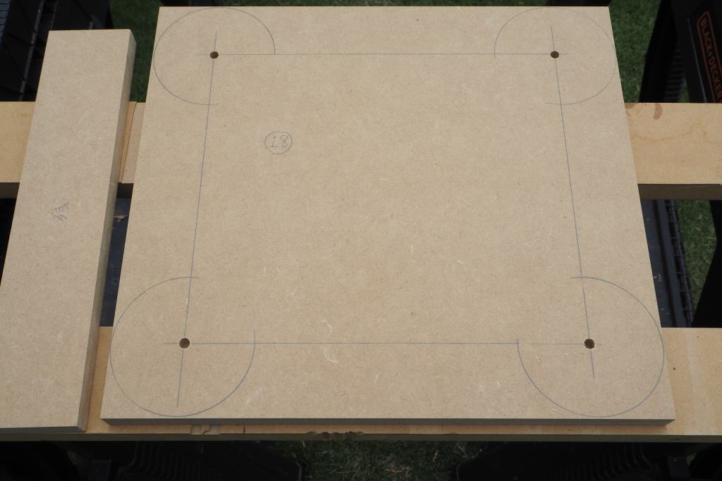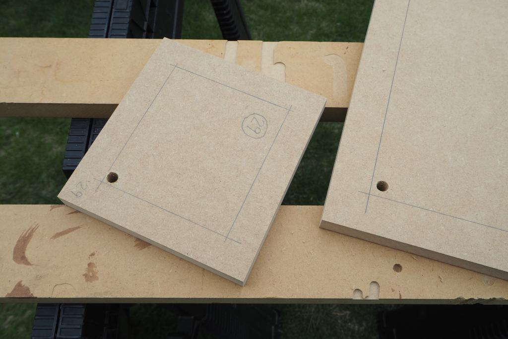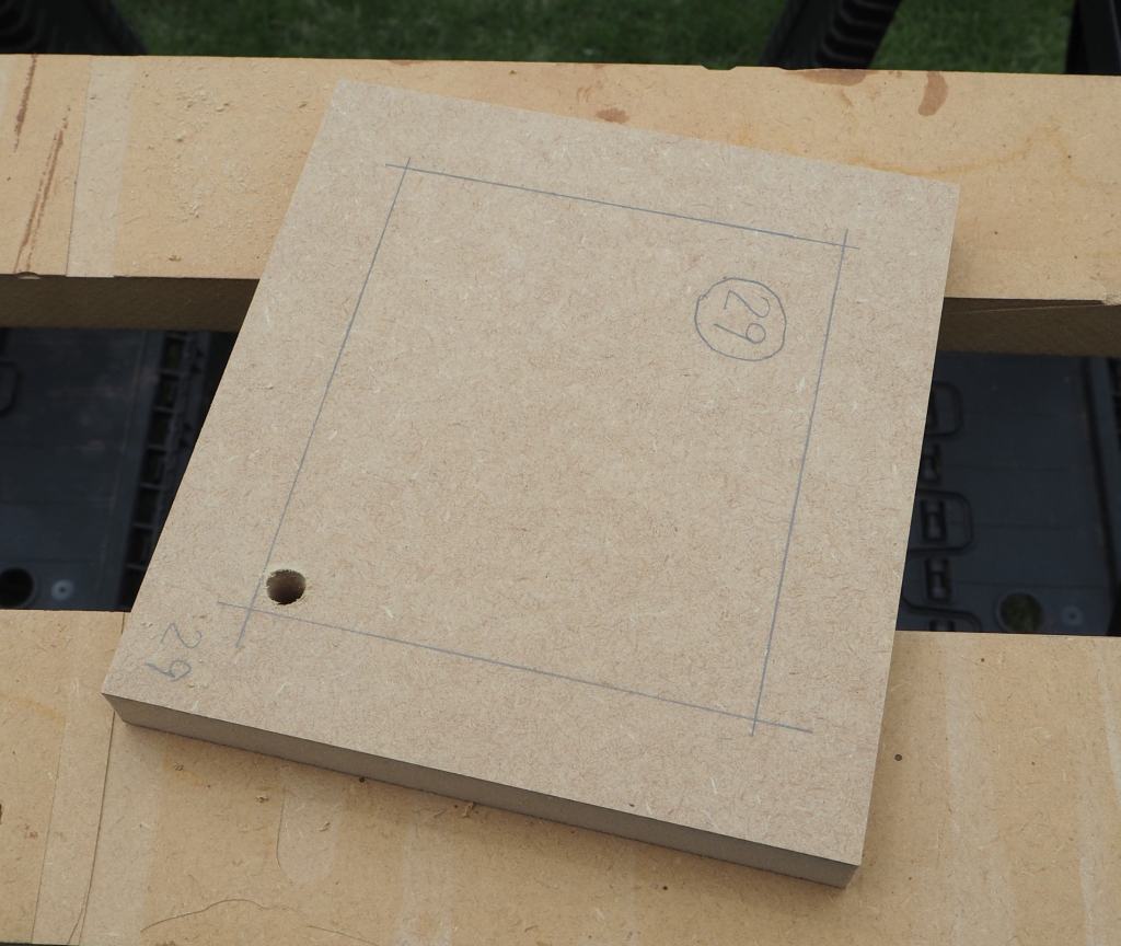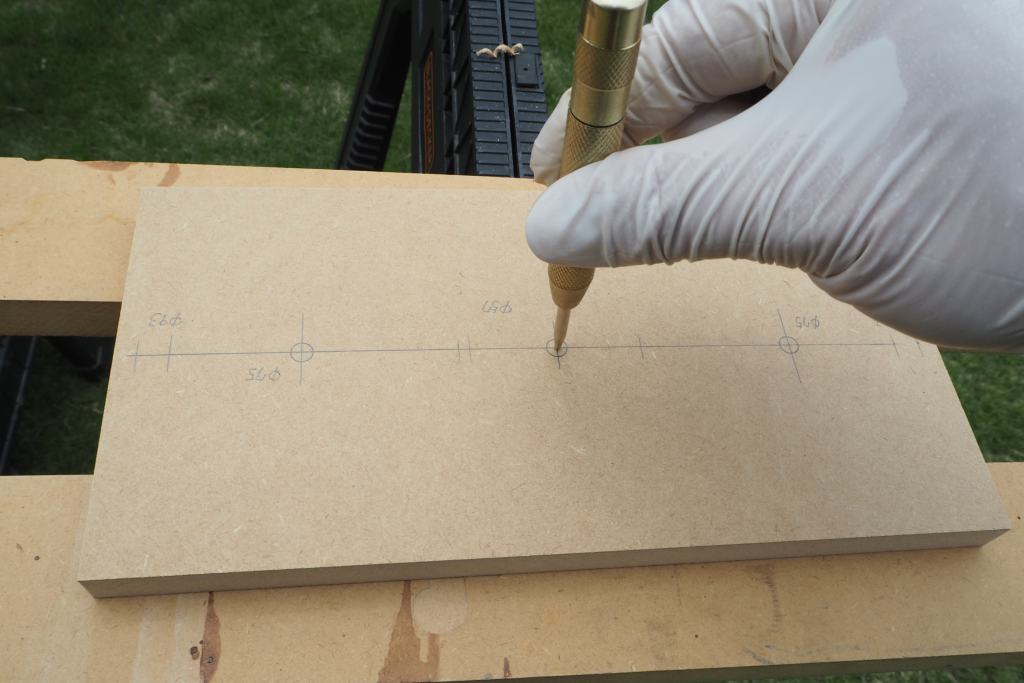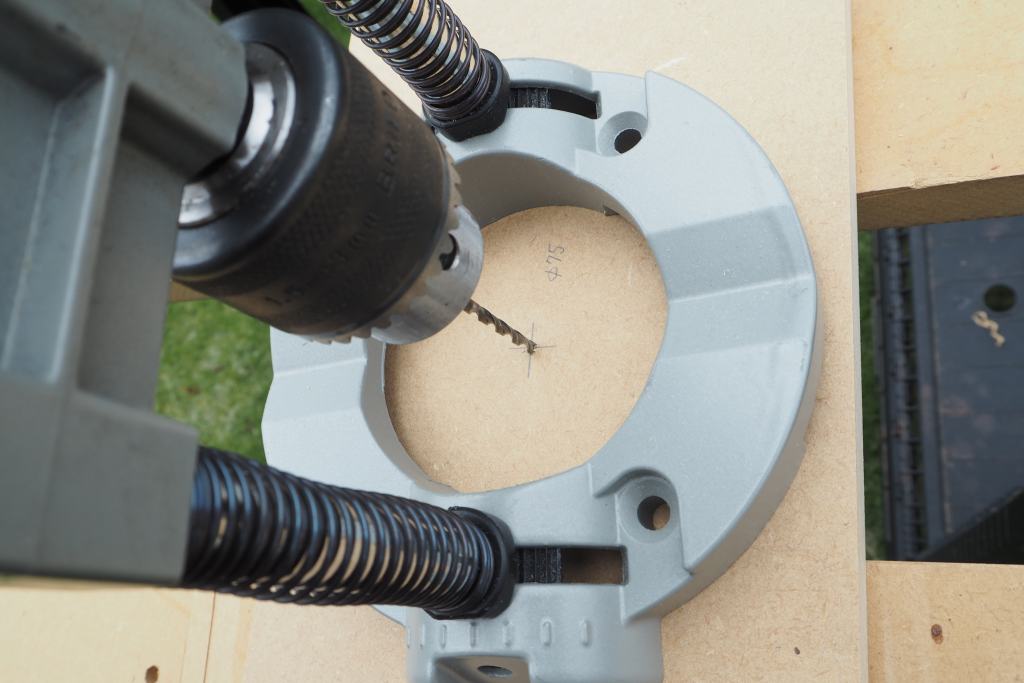 ドライバー(ここではスピーカーのこと)の開口を空けるためのセンター下穴は、板を貫通する必要がありません。板厚の半分くらい彫り込めばジグが入るので、十分です。