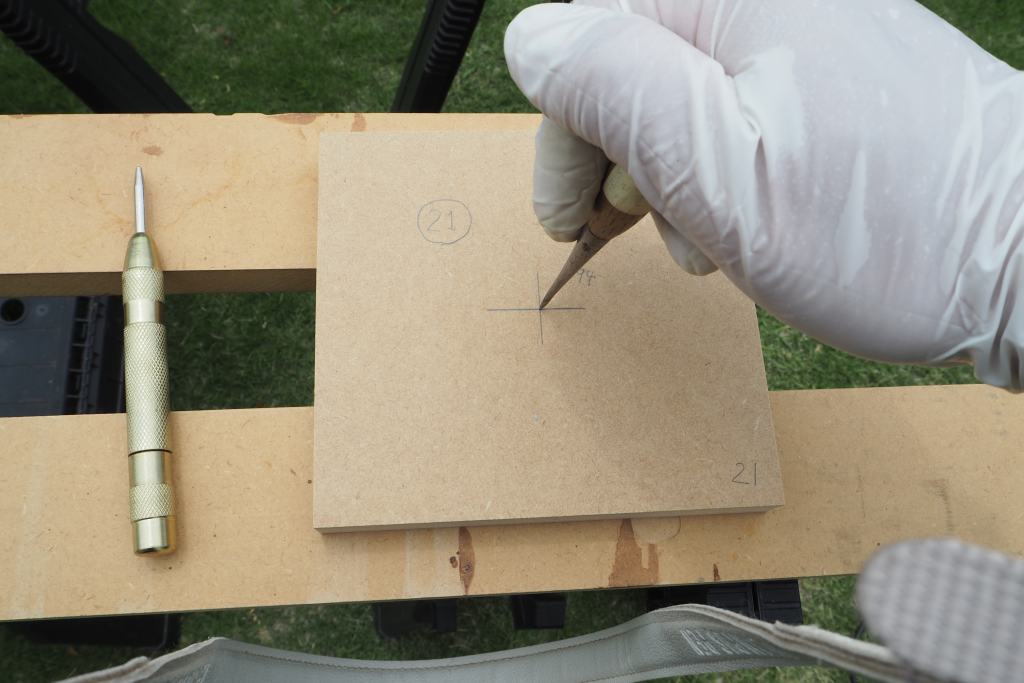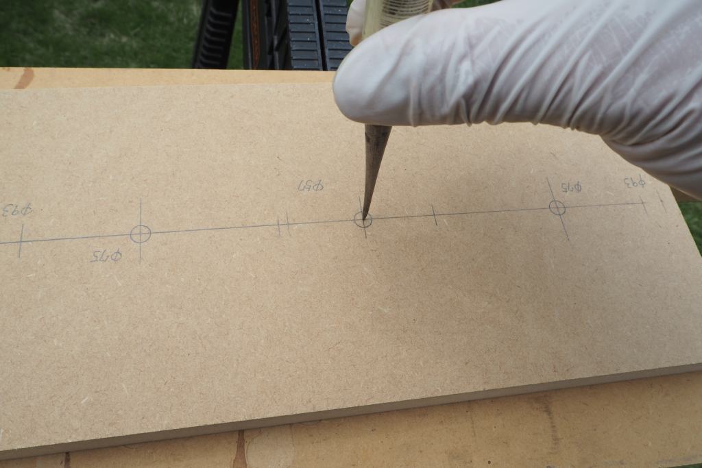 ドライバーのセンター下穴をあけるため、まずは鋭いクジリで痕を付け、