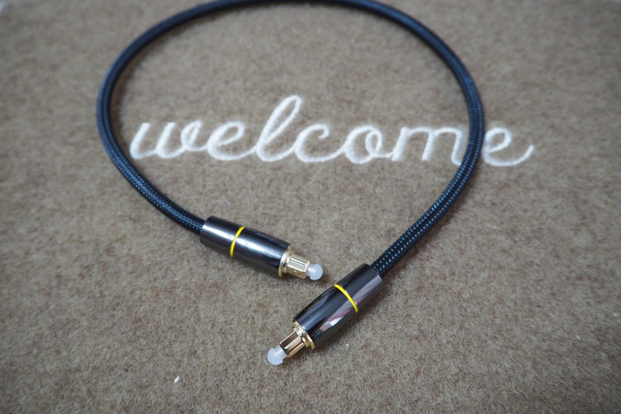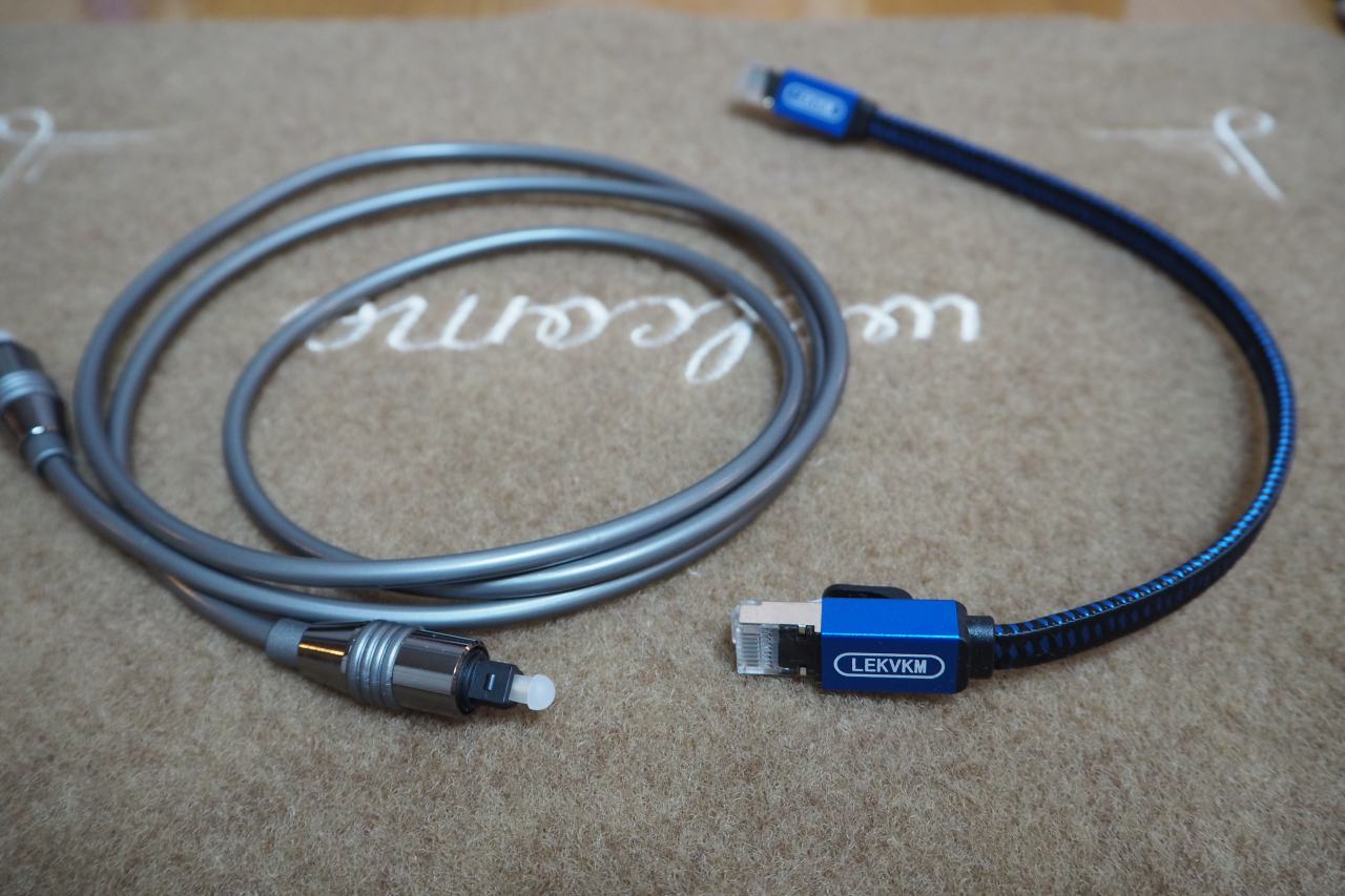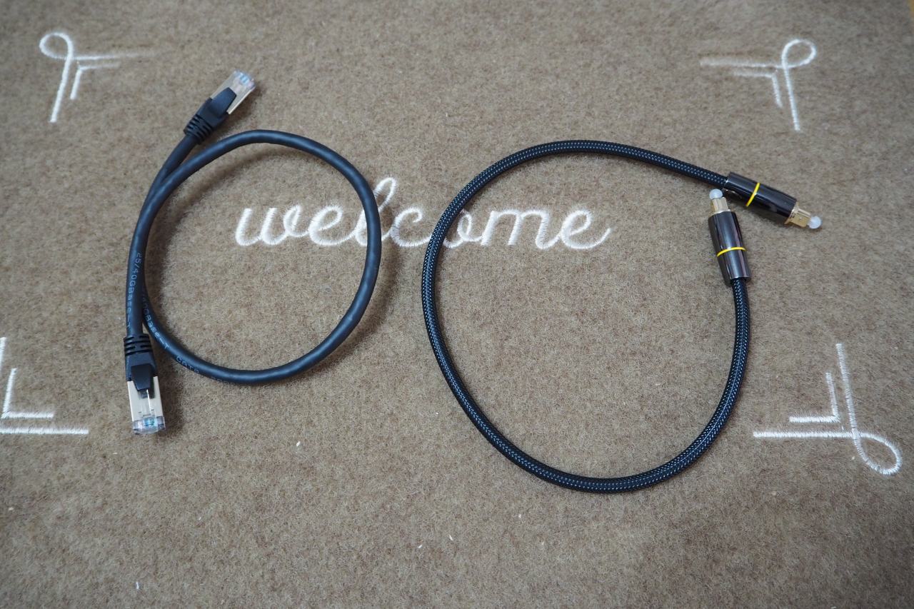 風化して開通しなくなったTOSLINKの代わりに買ったテキトーな光ケーブルと、右はLANケーブル。平ケーブルではあるが、けっこうしっかりしたツクリで、元々CAT8だったみたい。しかも超短い。替える必要無かったかも(笑