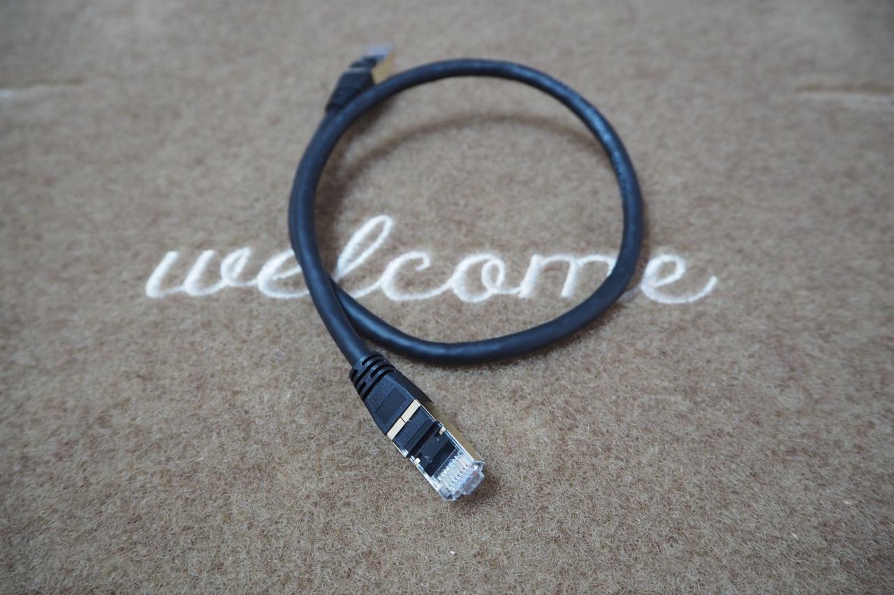 CAT8が良いらしいぞ、更にはシールドしっかりが良いらしいぞと聴いたため、ごついシールド付きの太めのケーブルにしました。しかも接点はすべて金メッキ。CATは必ずしも高速が良いというわけではないらしいですけどね、シークスピードには好影響があるでしょう。でもシールドは効くのかも。元々、CAT8が使われていたので速度は期待薄です。