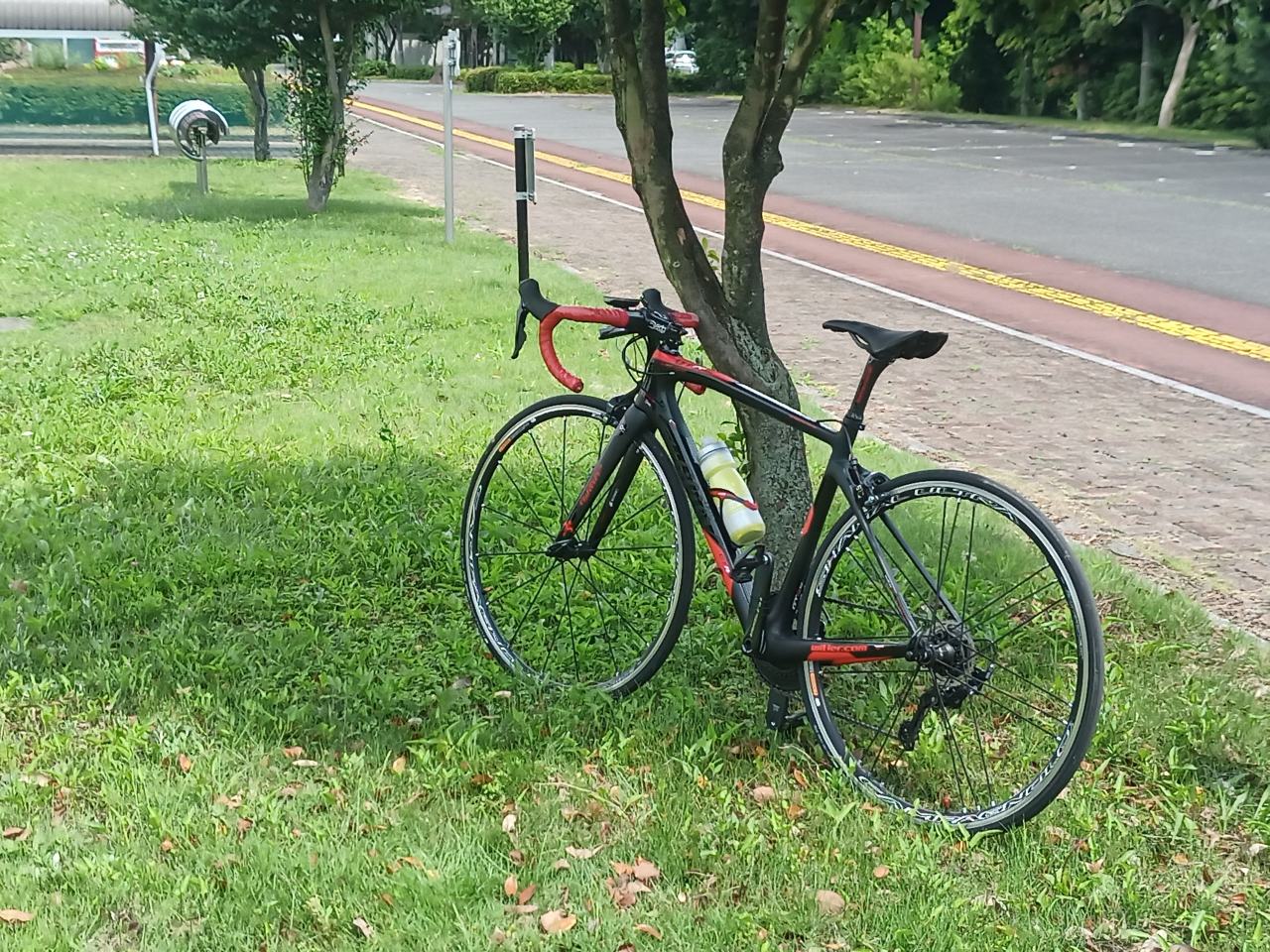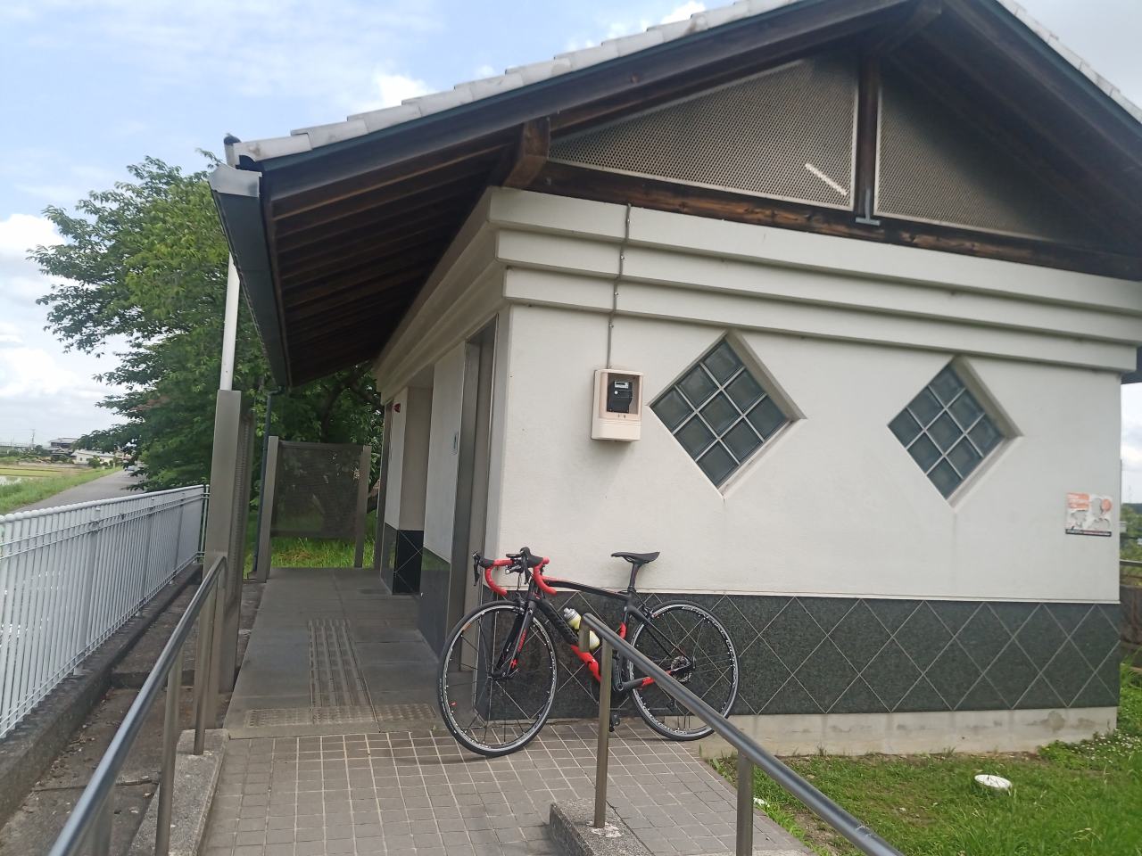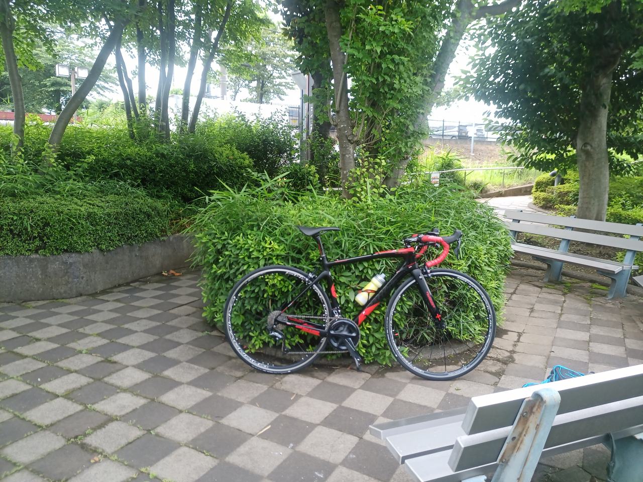 チェーンロックを忘れたってことは、このバイクが自立しないということなんですよね。(リドレーみたいにスタンドを常備してるわけでもなし)よって、何処かへ寄りかかるわけですが、風などで倒れてしまいます。その点、このフェンスはハンドルが引っかかる高さなので、本当にちょうど良かったのです。