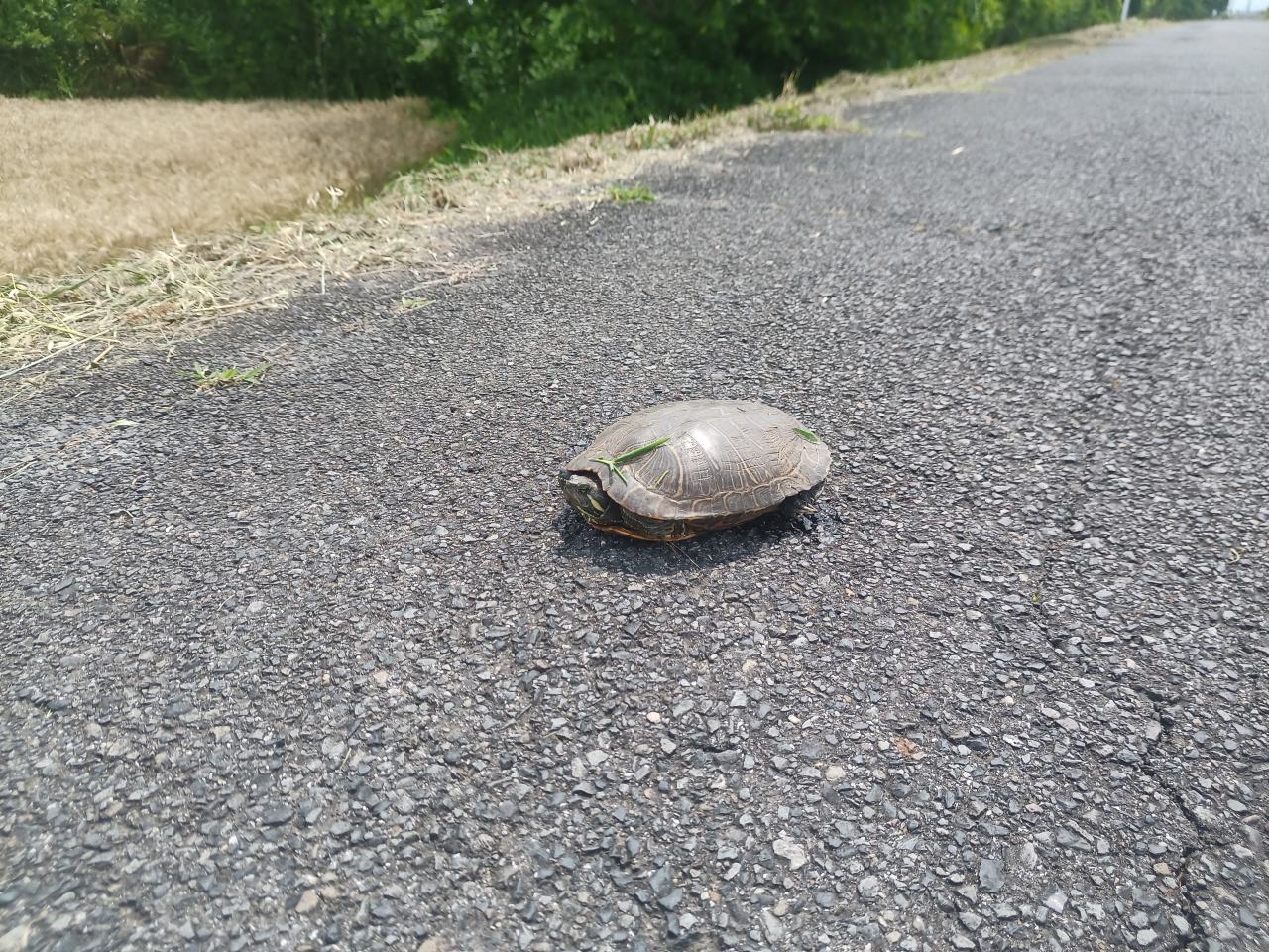 レンズしてみると、これはどうやらミシシッピアカミミガメ。ペットとして日本に大量輸入されて、その後飼育放棄されたものが野生化して日本全国に大量繁殖した品目らしいじゃないか。彼らに罪はないが、在来種カメの卵を全部食べちゃうから、在来種が絶命寸前ってのも困るな~