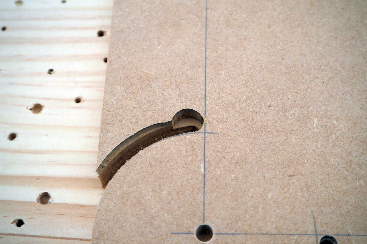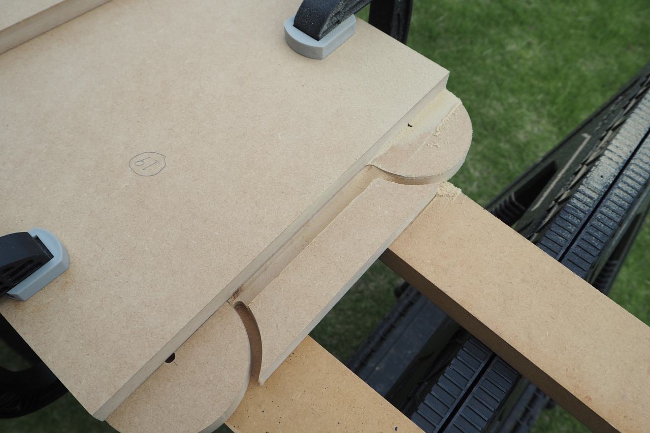 実は部材もほんのわずかに削れます。だから、基本的に部材をジグに当てるのはNGです。ですが、この部材は「削れてもよい部分」をあてがっているので、大丈夫なのです。