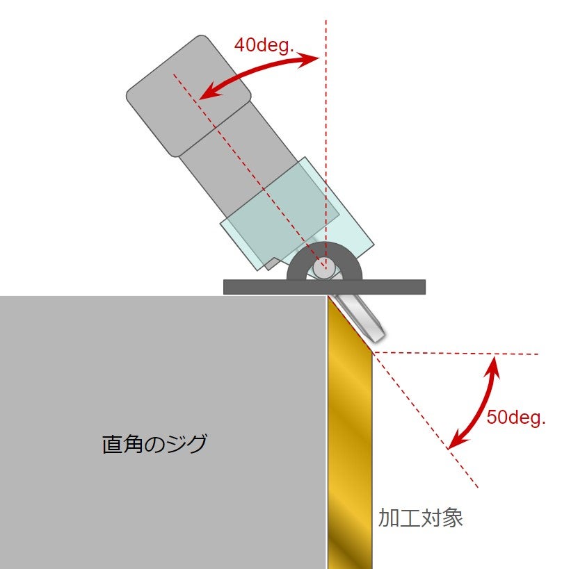 部材が直角の状態で刃を当てれば、40度の傾斜角で50度の掘り込みができます。
