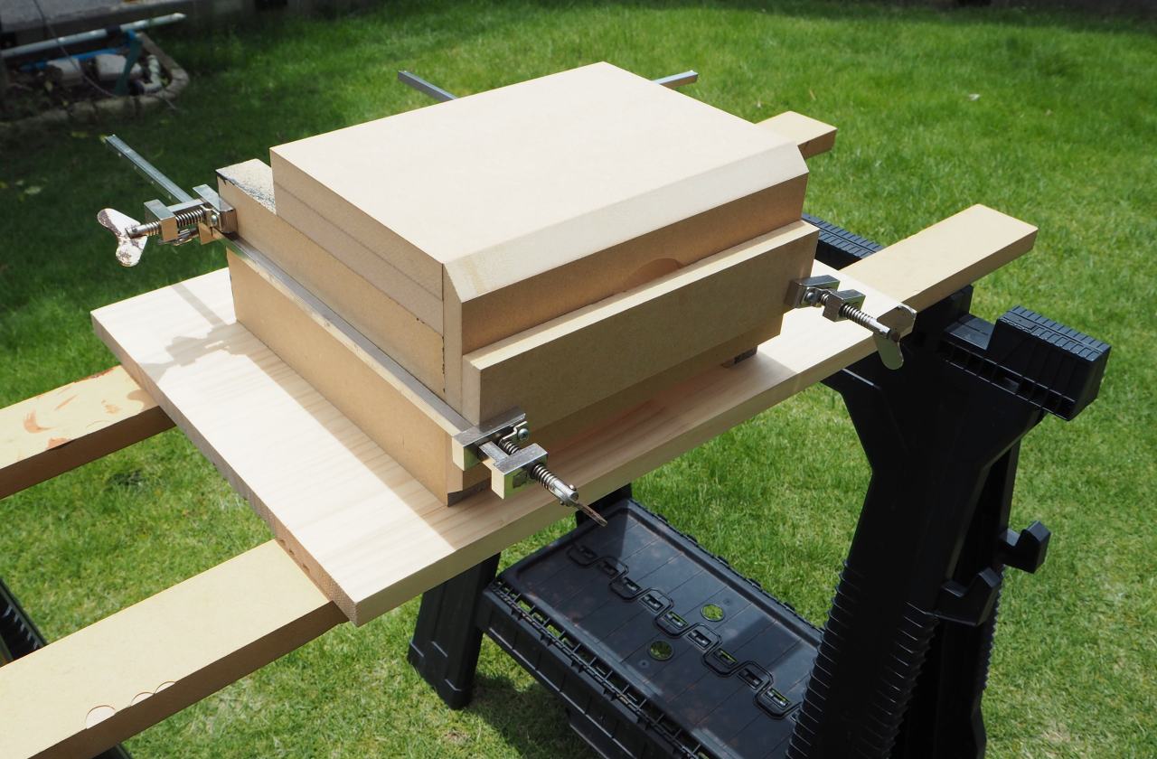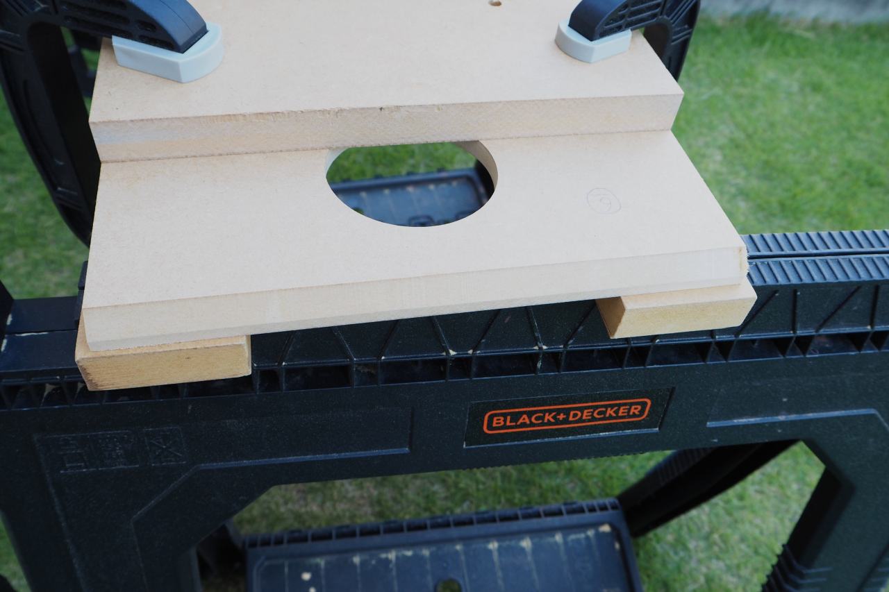 適当なジグが見つからないので、手持ちの端材などを組み合わせて、それっぽく組んでみました。