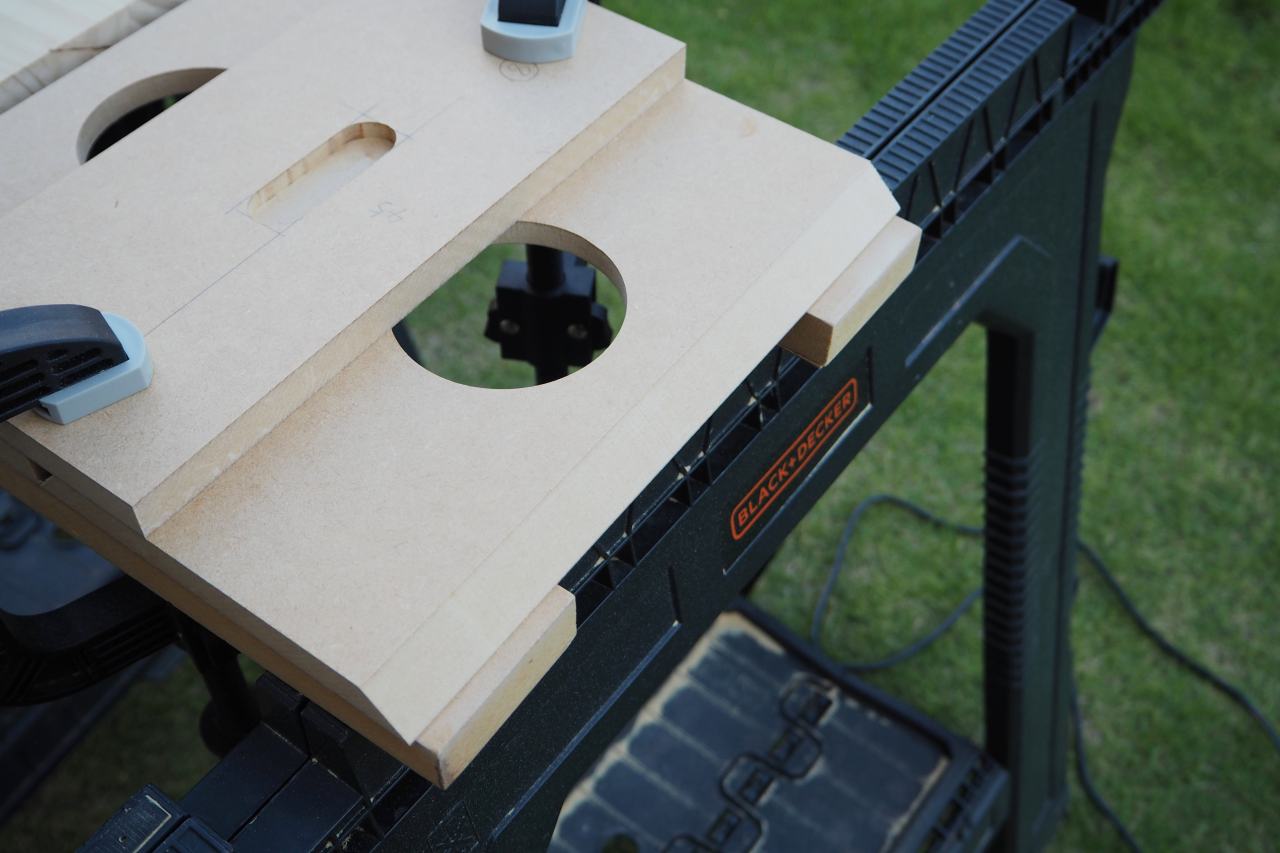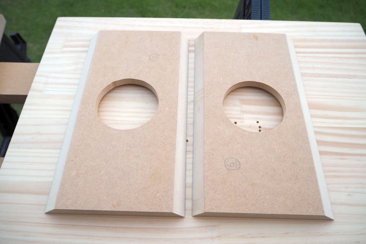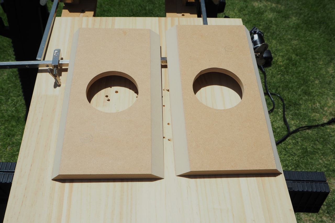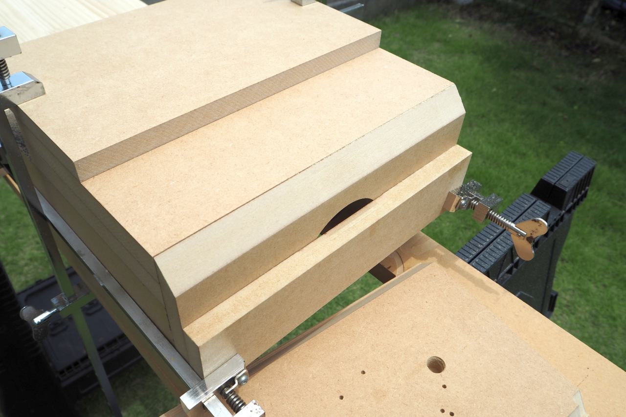 新しいトリマーも入手して、新しい傾斜トリマーベースを使い、45度以外の不定斜度でバッフルをカッタウェイするという、自身でも新しい試みです。
