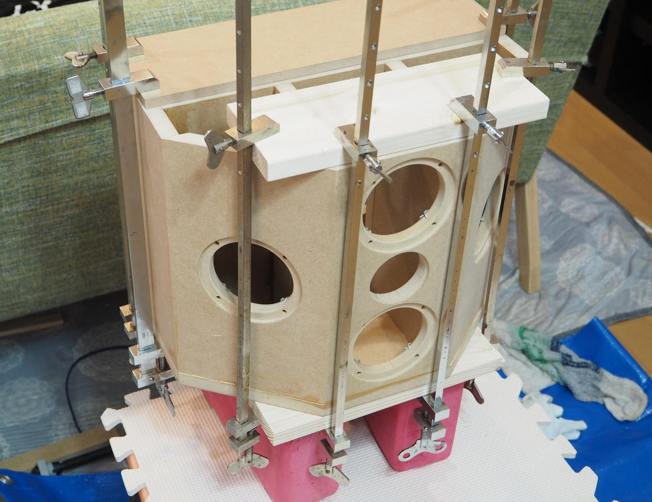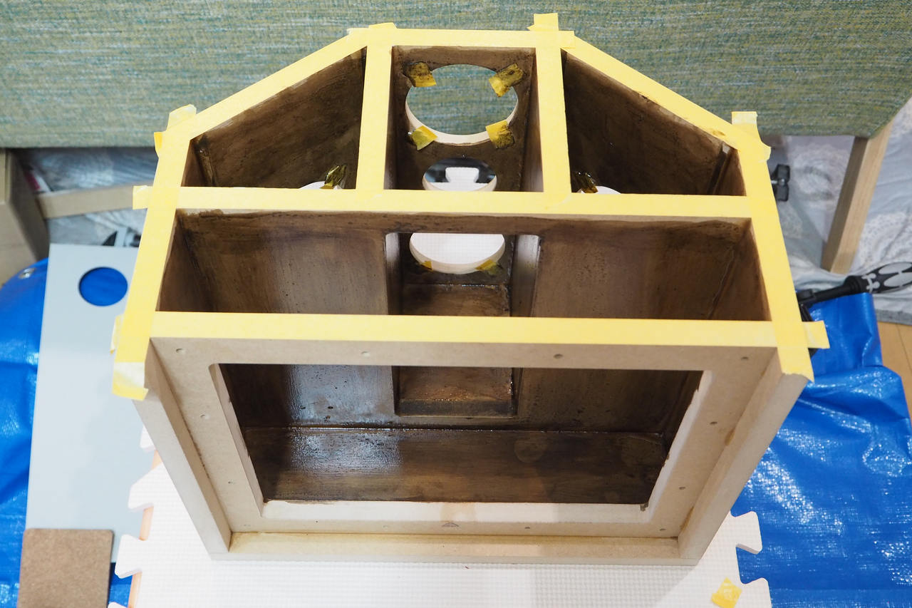 TV用のトランスミッションラインも、UltimateMicroSubもそうでしたが、このスピーカーは内部構造そのものが複雑なブレーシングを兼ねているので、もともと剛性が高いです。1/3くらいの小ささのスピーカーと等価。それでもこうして内部を塗るとかなり打音が変わります。