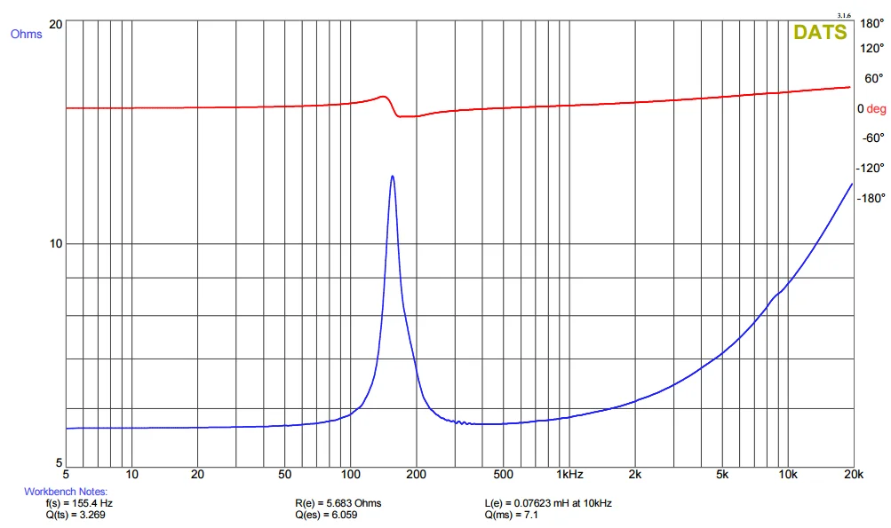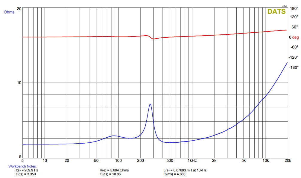 低域は想像では200Hz止まりかな、と思っていたら150Hz位まで十分に伸びていて驚き、これならば低音「感」もあるはずです。この低域下降特性はこのエンクロージャー:Fs=270Hzの密閉箱へ取り付けたときの特性です。Fsが270HzであってもシステムQが飛び抜けて高いから、低域が盛り上がってくれるのでしょう。惜しむらくは、5kHzから上で、振幅も位相も乱れが顕著になっています。音楽を聴いていると5kHzより上の帯域でカラーレーションを感じることが多いかもしれません。