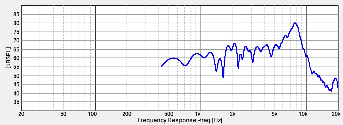 いわゆる「フルレンジ」は紙のメンブレンが使われることが多く、この図に見られるような高い共振峰は見られません。しかしそれは特性が整って良好なのではなく粗が分散されているからです。紙の場合は5kHzよりもっと低い周波数から分割振動が始まってカラーレーションが始まっているが、見かけ上は共振分散されているから特性上の粗は目立ちにくくなります。(共振していないということではない)
