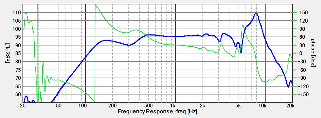 特にコレがフルレンジではなくミッドレンジとして設計されたものであれば、満点をあげてもいいくらいに優秀。500-5kHz帯域は位相特性は特に優秀と見えます。また、その帯域での振幅もかなり平坦です。