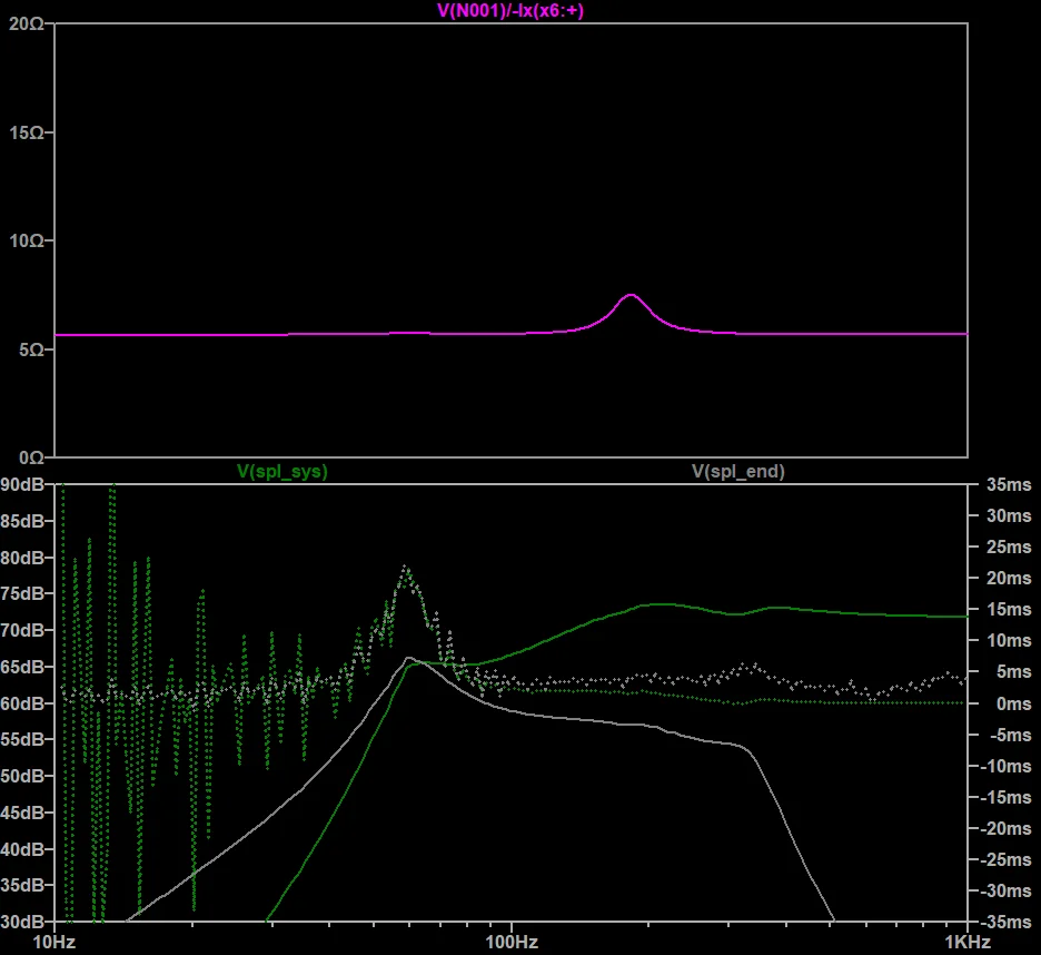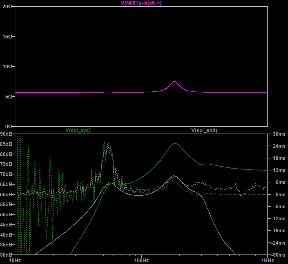 この1.6inchのフルレンジはQts=3.41と極端に高い数値を示すもので、したがってT/Sの模擬範囲を逸脱しています。ということは、このSpicyTLのSim結果もあまり信用なりません。Qが極端に高いドライバでは想定した挙動にならないリスクがあります。