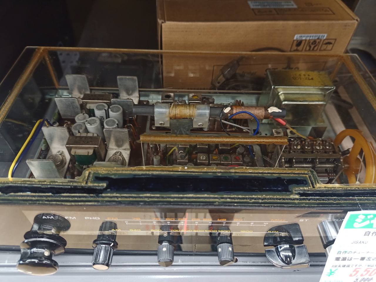チューナー部分は、どこぞのチューナー基板をまるごと移植してきたものなのかなあ。チューニングスケールやノブなどの実装は自作の気配があります。3連くらいのバリコンが見えるけど、バリコンやRFはスクラッチで自作が困難と思われます。