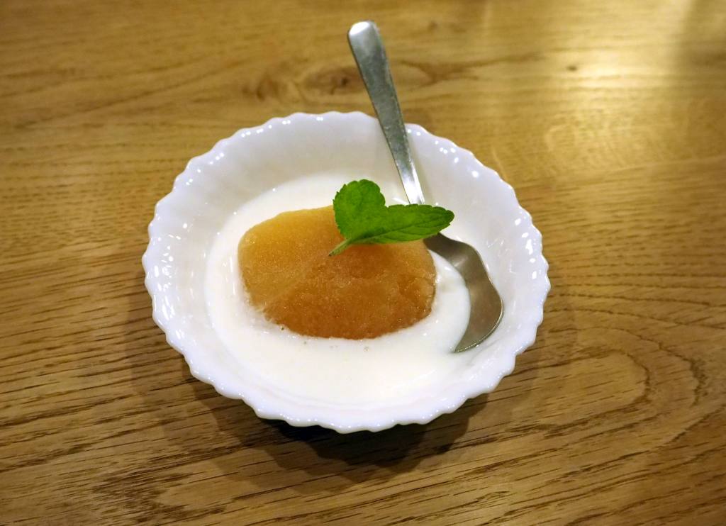 ラスト、デザートはベイクドアップルヨーグルトのミント添え。手は込んでいる。