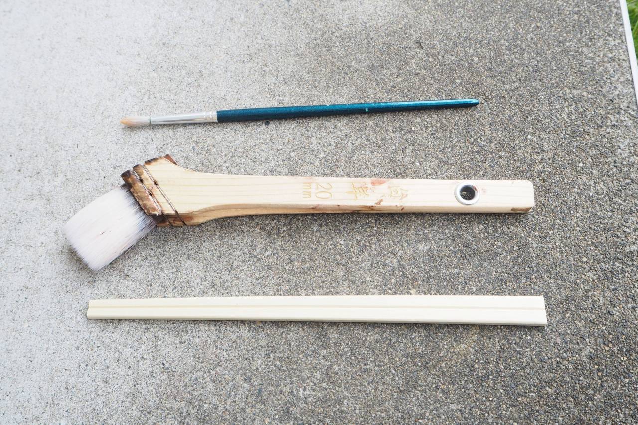 今回は、細かい部分を塗る絵筆(主にポートを塗る)と、20mmのハケを用意しました。今回は塗料のボトルに直接ハケを突っ込みますので、少し細めのハケが良いと思います。