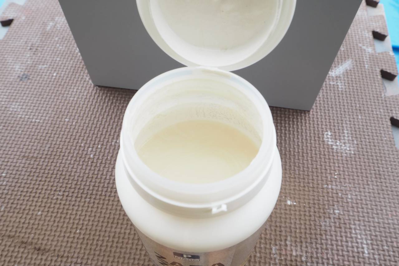 では、どうしたのかというと、けっこう多めの水(+25%以上)を投入してから、ひたすらシャカシャカと振りました。そうしたら、無糖ヨーグルトくらいの粘度にはなってくれ、傾けるとドロリとボトルから出てきました。この濃度で行ってみます。