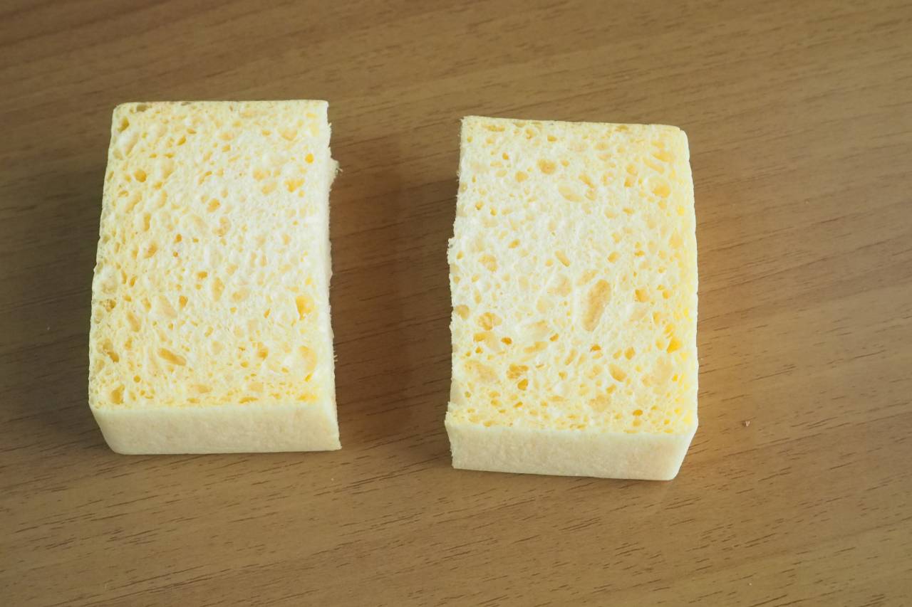 塗布には、あらかじめ百均で買っておいたこちらの美容スポンジを使います。有孔スポンジですね。この粗目が良いんです。こいつに塗料を染ませてポンポンとタッピングして、塗膜に表情を出します。
