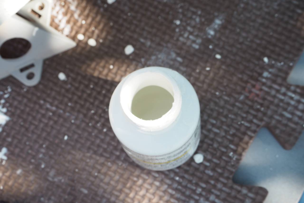 塗料を開けてビックリ。これは大変な代物です。なにせ、粘度が高過ぎて傾けてもまったく落ちてきません。長期在庫で固まっちまったのかな?試しに他のボトルも開けてみましたが同じでした。どうやら「こういうもの」のようです。試しにそのまま塗布してみましたが、あまりにも粘度が高く乾燥が早い上にすぐ亡くなってしまいそうです。何と言ってもボトルから出てきません。