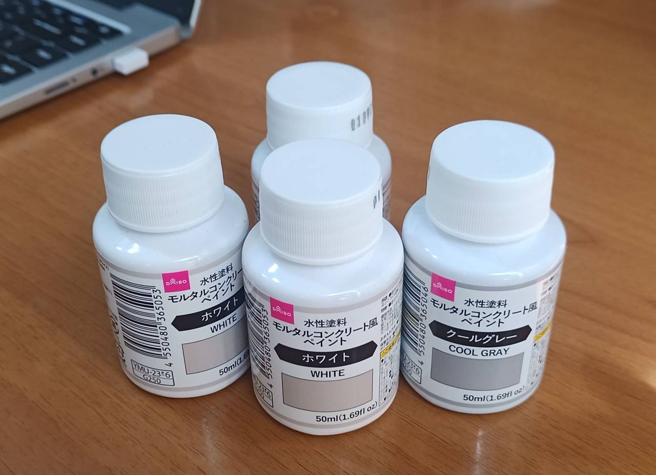 今回上塗りに使うのはこちら。ダイソーで在庫極小を買い占めしてきました。モルタル・コンクリート調の水性塗料です。これ、すごーく小さいの。50mLと書いてある。1ボトルにほんのちょっぴりしか入っていません。足りるかな?